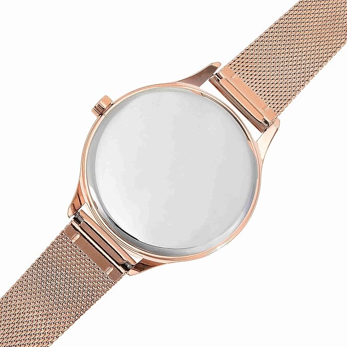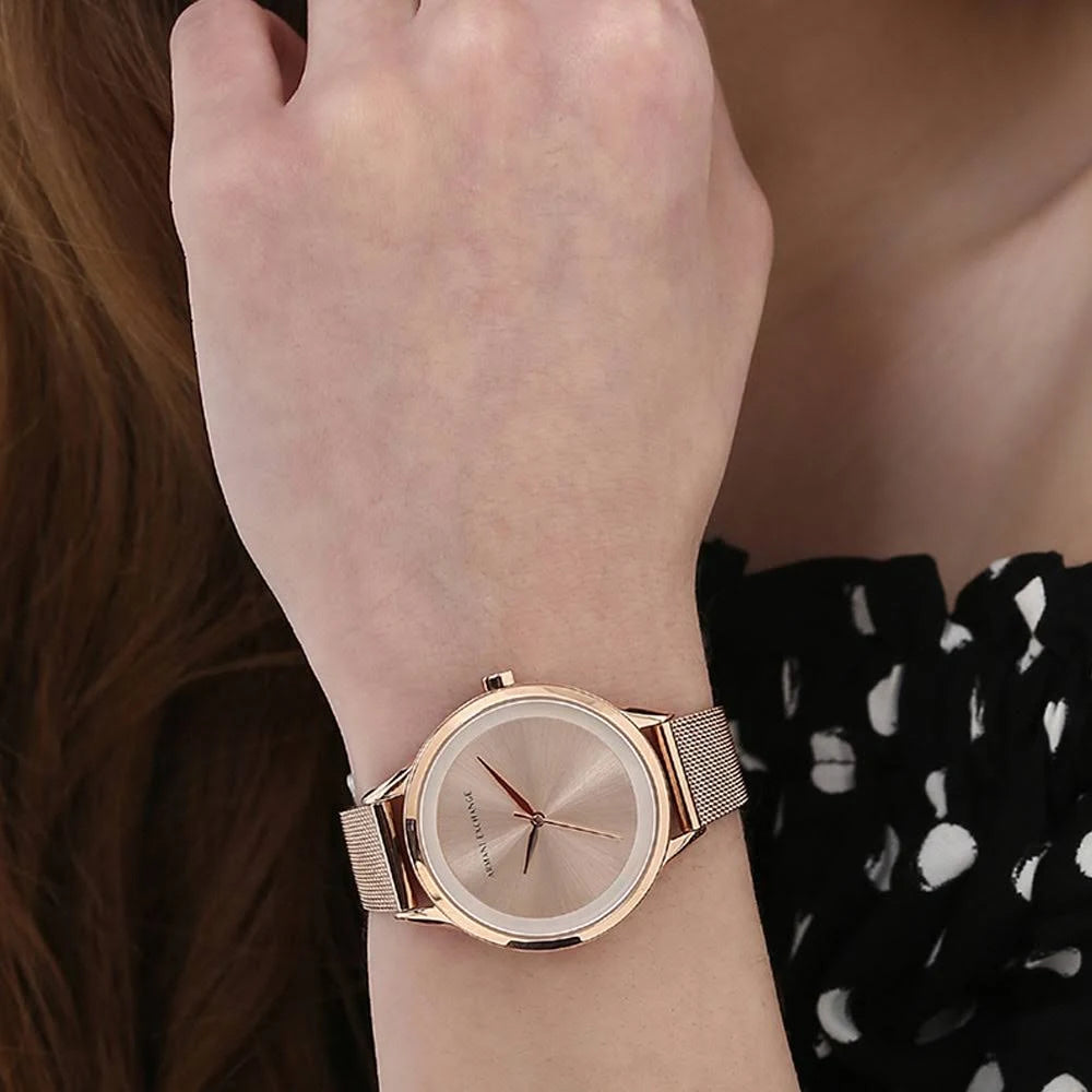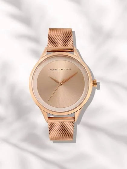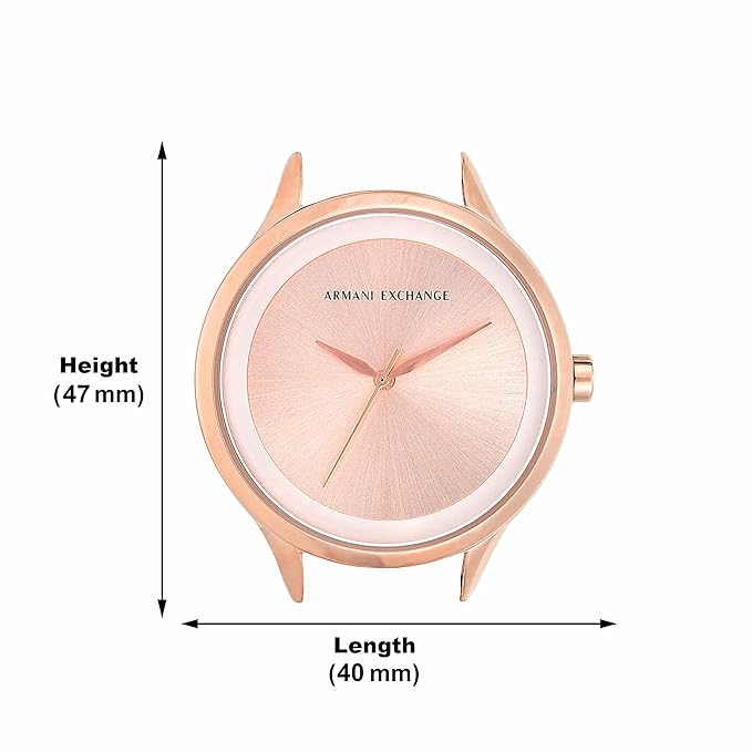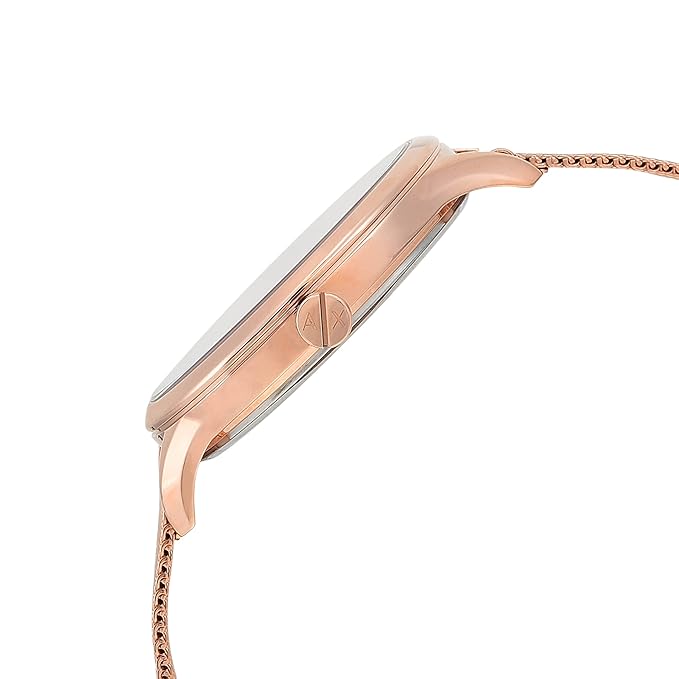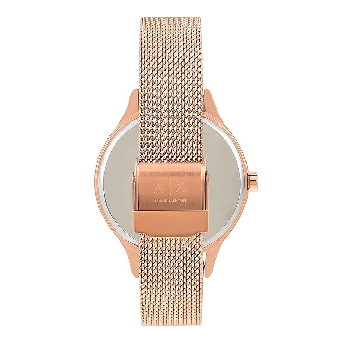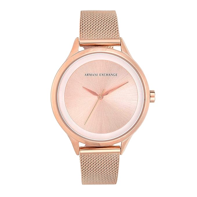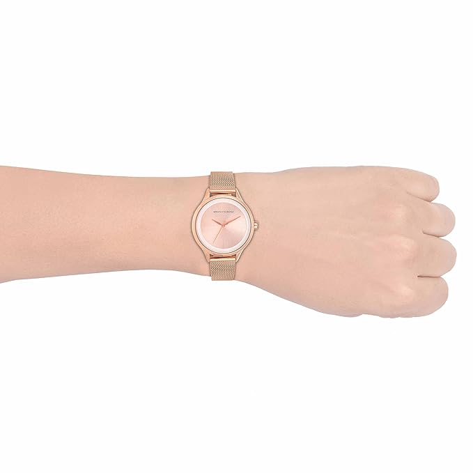 A must-have timepiece for all the watch aficionados, this women's analog watch from Armani Exchange will be a perfect pick. Its strap vaunts a rose gold hue that enhances the look of the watch. Housed in a case, the rose gold round dial is protected by a mineral glass. It showcases plain 3-hand, and a crown for time adjustment. Furthermore, it is complemented with a deployment clasp clasp that ensures a secure fit on the wrist.