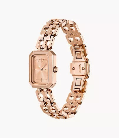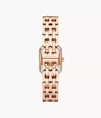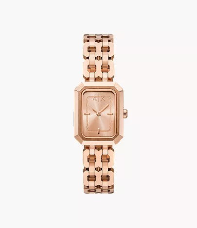 The Armani Exchange Two-Hand Rose Gold-Tone Stainless Steel Watch (AX5814) is a refined timepiece designed for modern elegance. With its 27 mm stainless steel case and bracelet in a matching rose gold finish, this watch brings a touch of luxury to everyday wear. Featuring a quartz two-hand movement, mineral crystal, and 5 ATM water resistance, it perfectly balances style with functionality. A bracelet butterfly deployant clasp ensures a secure and comfortable fit, making it a versatile choice for any occasion.