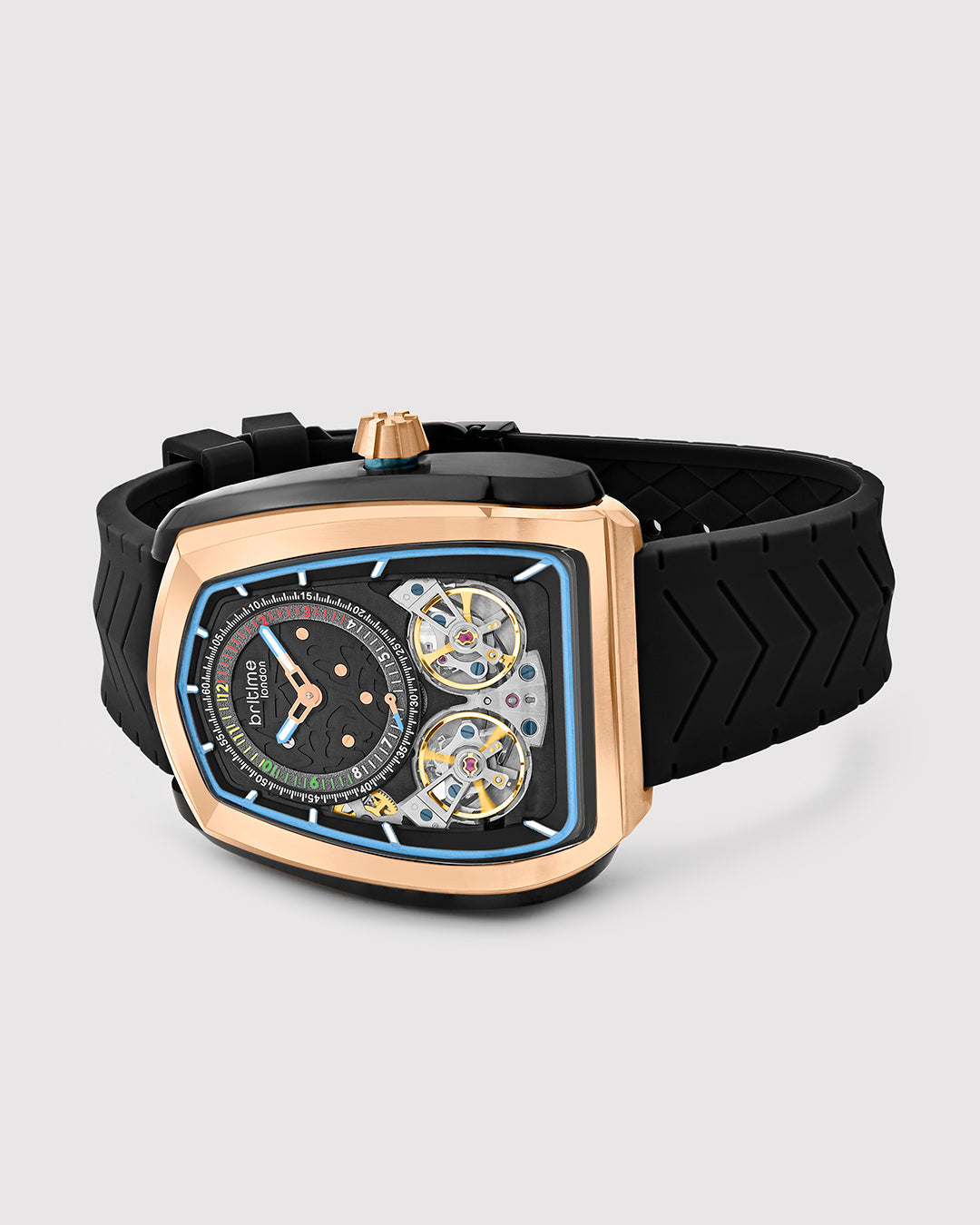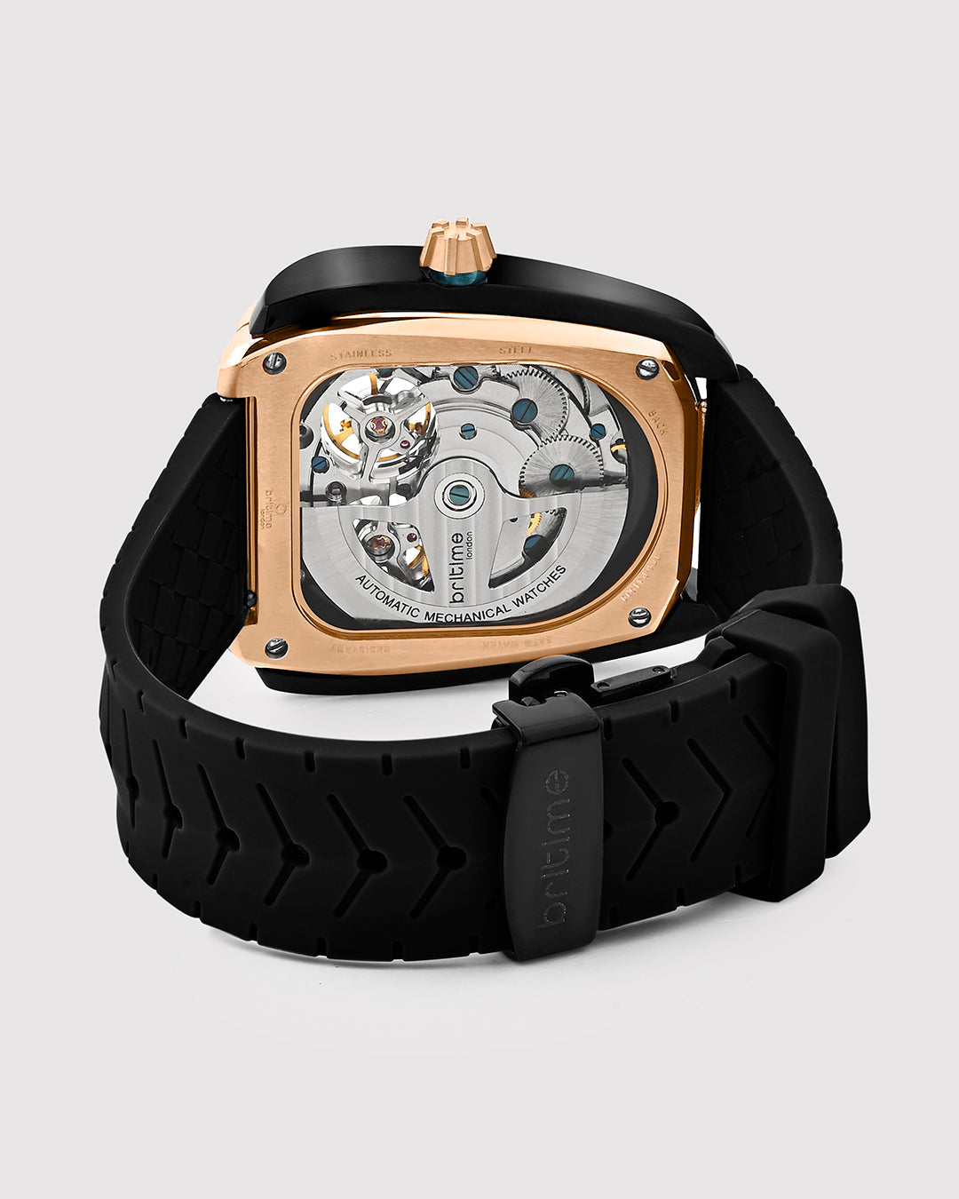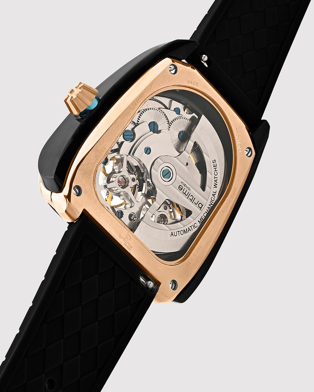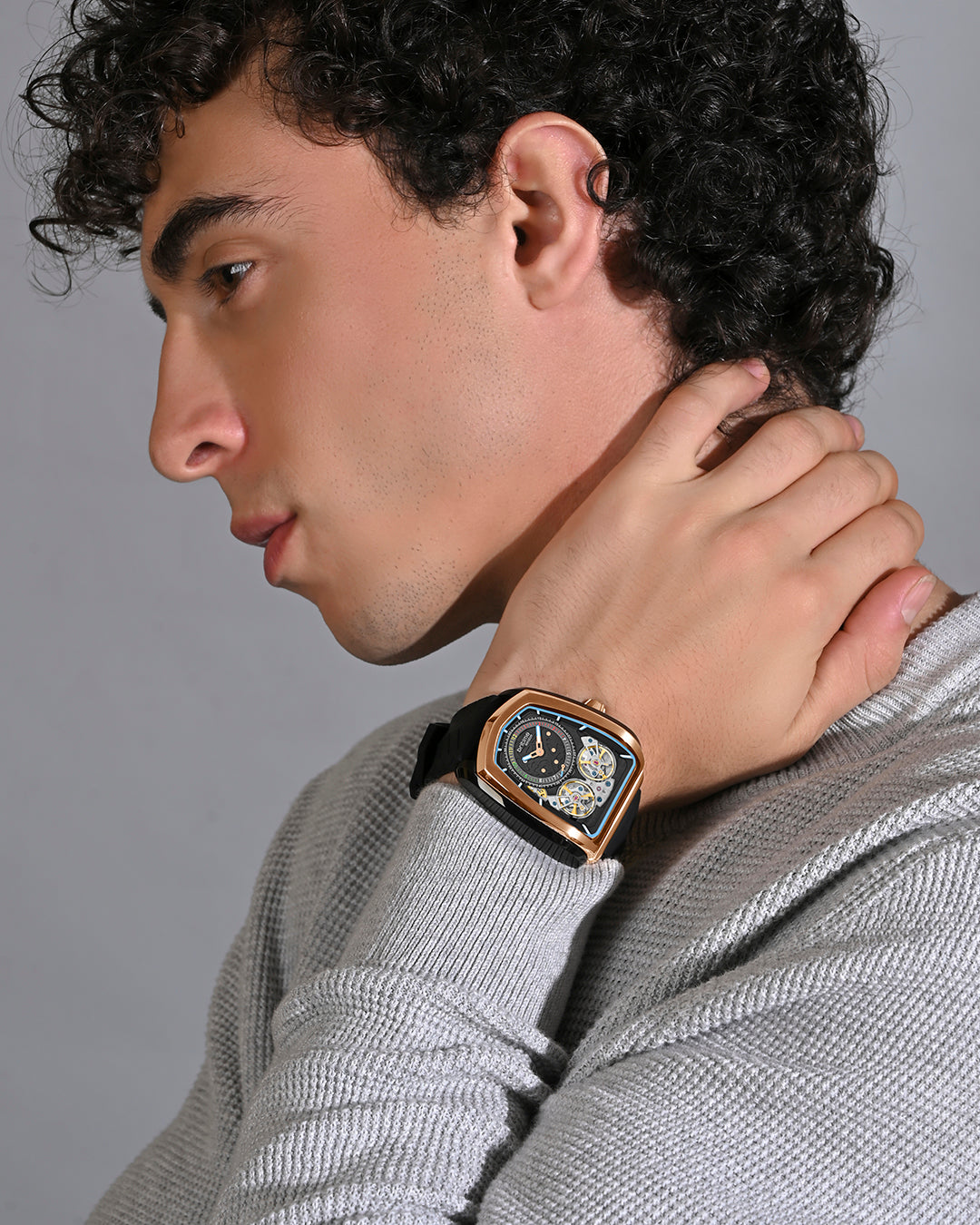 The Britime London Aventus Automatic Men’s Watch — Black with Rose Gold (101-P30406) is a powerful statement of modern luxury infused with bold mechanical character. Defined by its signature tonneau-shaped silhouette, the Aventus presents a dramatic architectural dial that puts precision engineering on full display. Dual exposed balance wheels, sculpted bridges, and layered detailing reveal the dynamic heart of its automatic movement, creating a visually striking and technically inspired design.