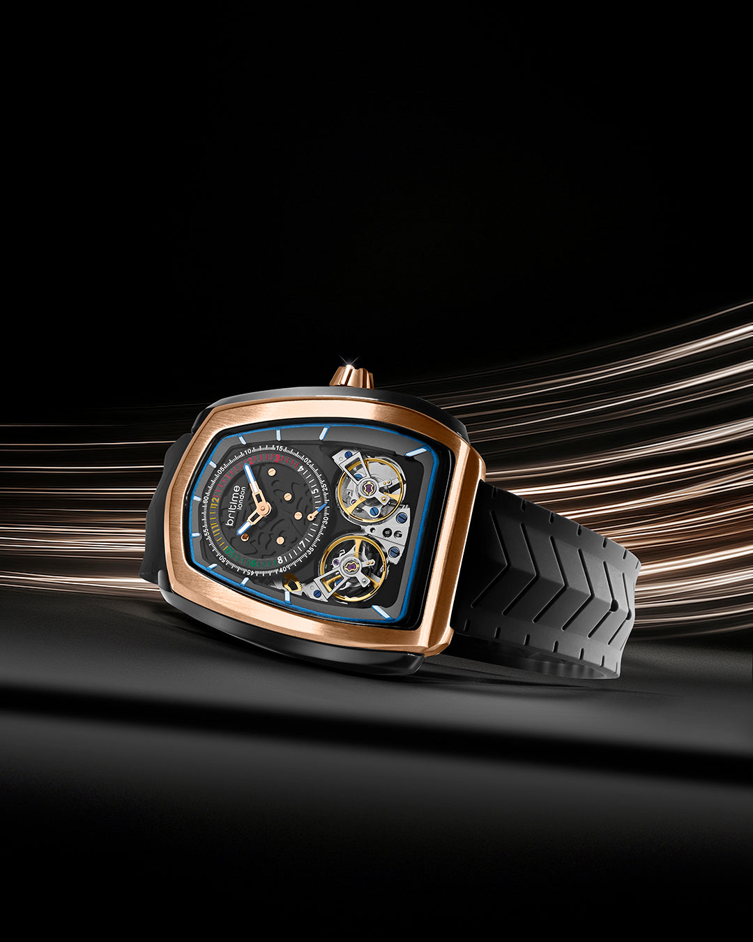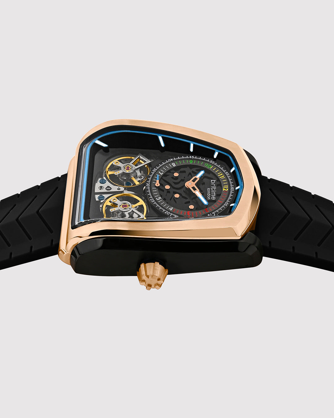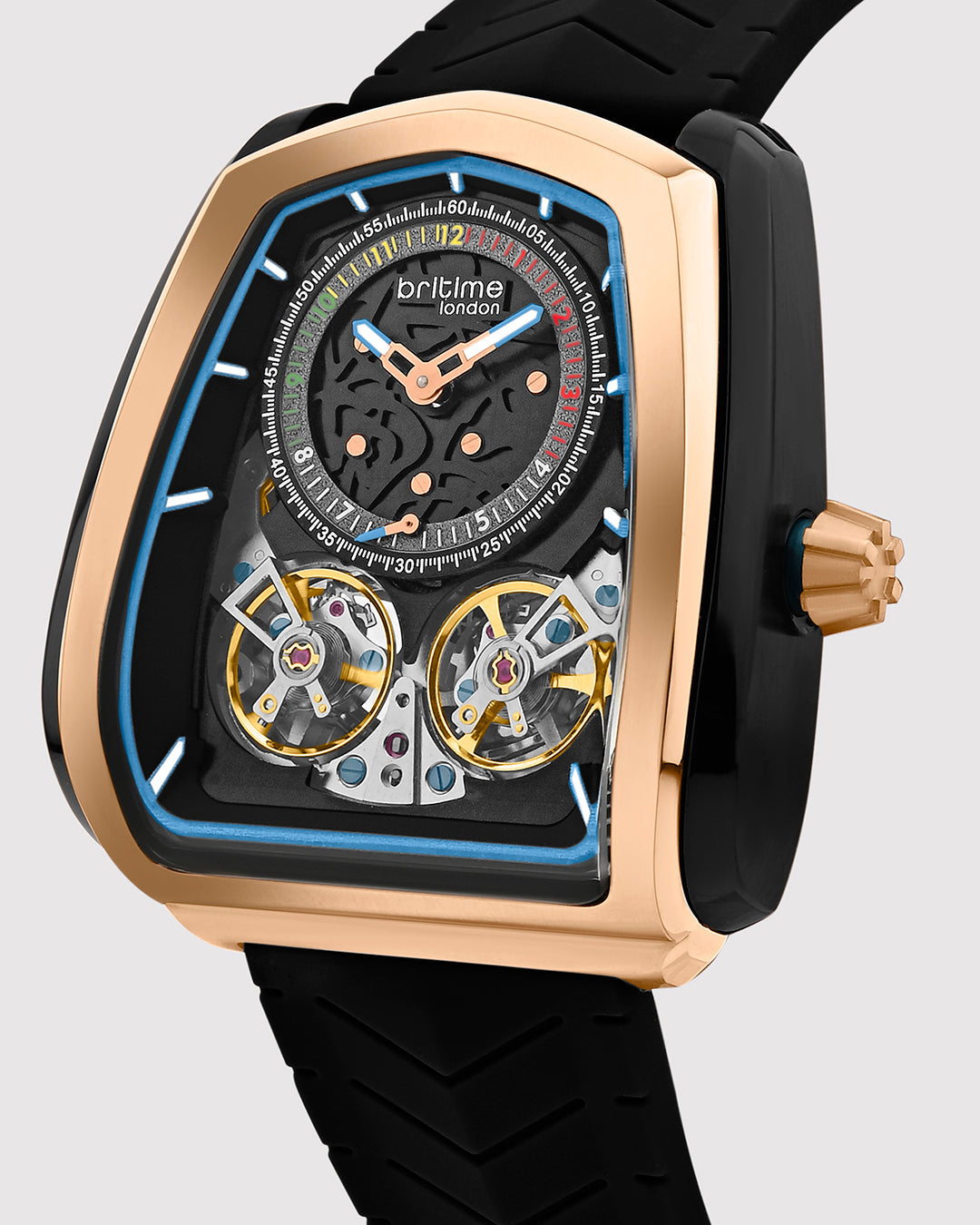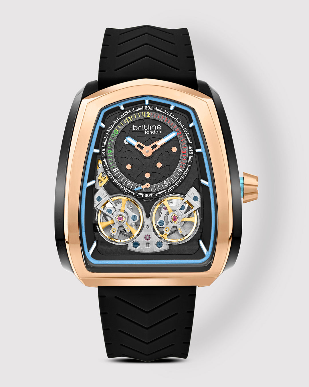The Britime London Aventus Automatic Men’s Watch — Black with Rose Gold (101-P30406) is a powerful statement of modern luxury infused with bold mechanical character. Defined by its signature tonneau-shaped silhouette, the Aventus presents a dramatic architectural dial that puts precision engineering on full display. Dual exposed balance wheels, sculpted bridges, and layered detailing reveal the dynamic heart of its automatic movement, creating a visually striking and technically inspired design.