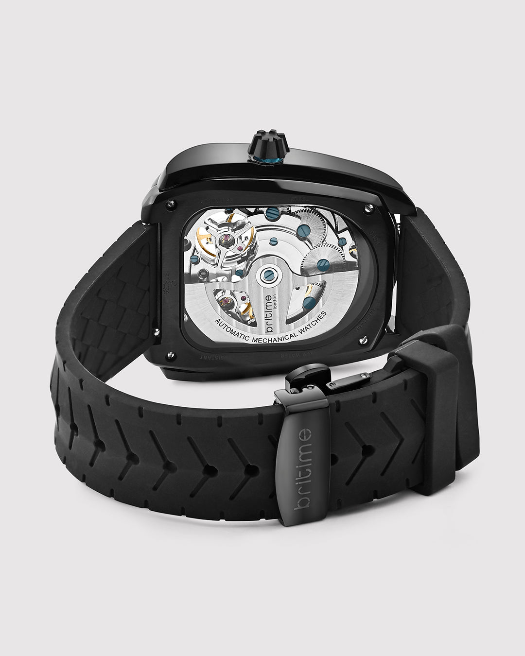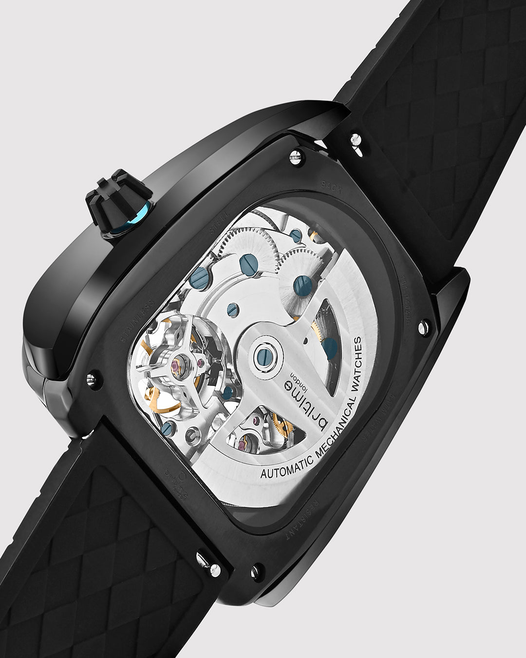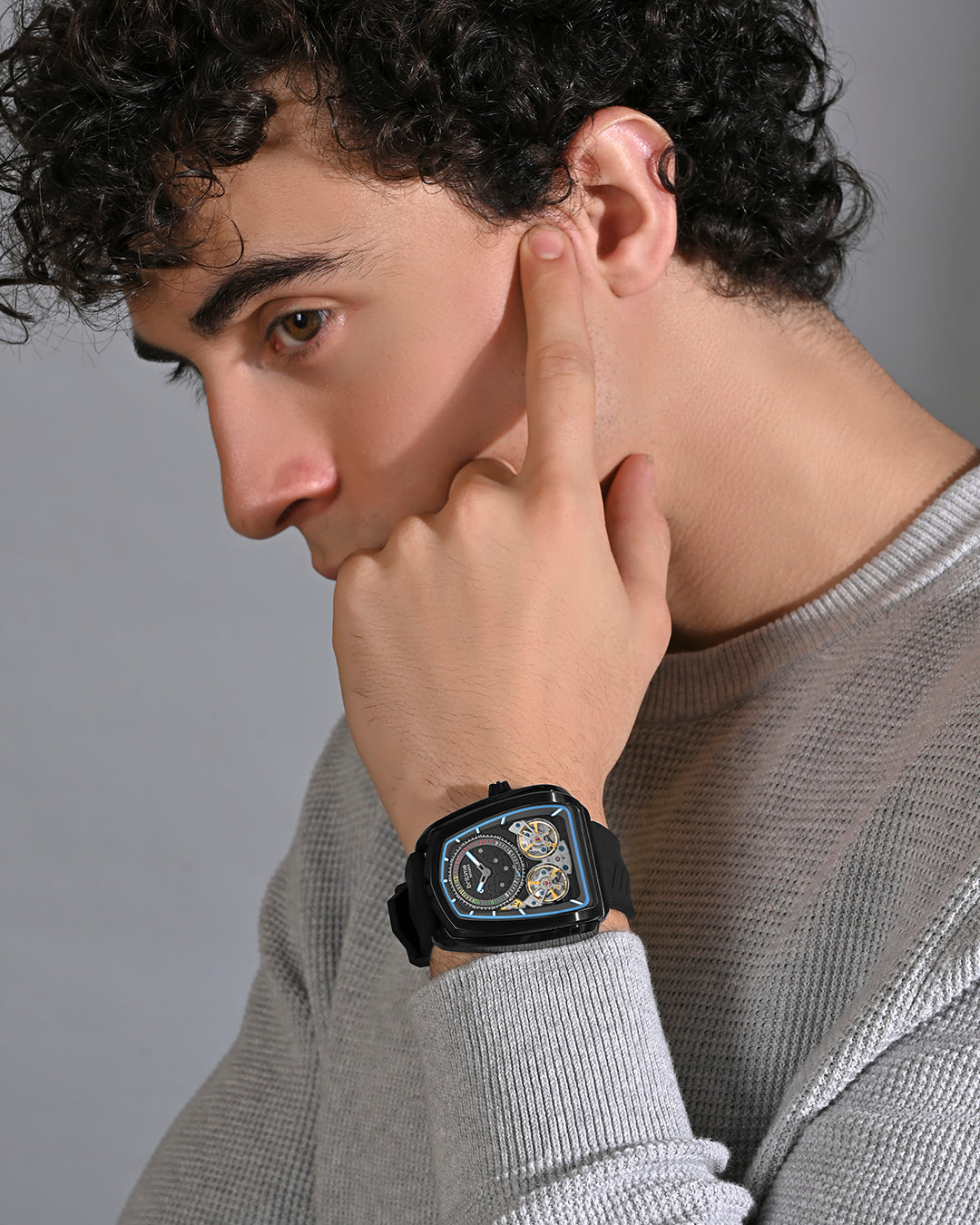 The Britime London Aventus Automatic Men’s Watch — Full Black (101-P40406) is a bold statement of modern sophistication, where cutting-edge engineering meets contemporary luxury. Defined by its distinctive tonneau-shaped silhouette, the Aventus commands attention with an architectural dial that showcases the artistry of its automatic movement. Dual exposed balance wheels, sculpted bridges, and layered construction bring the mechanics to life, creating a powerful and dynamic visual presence.