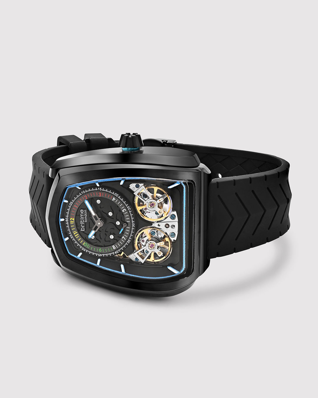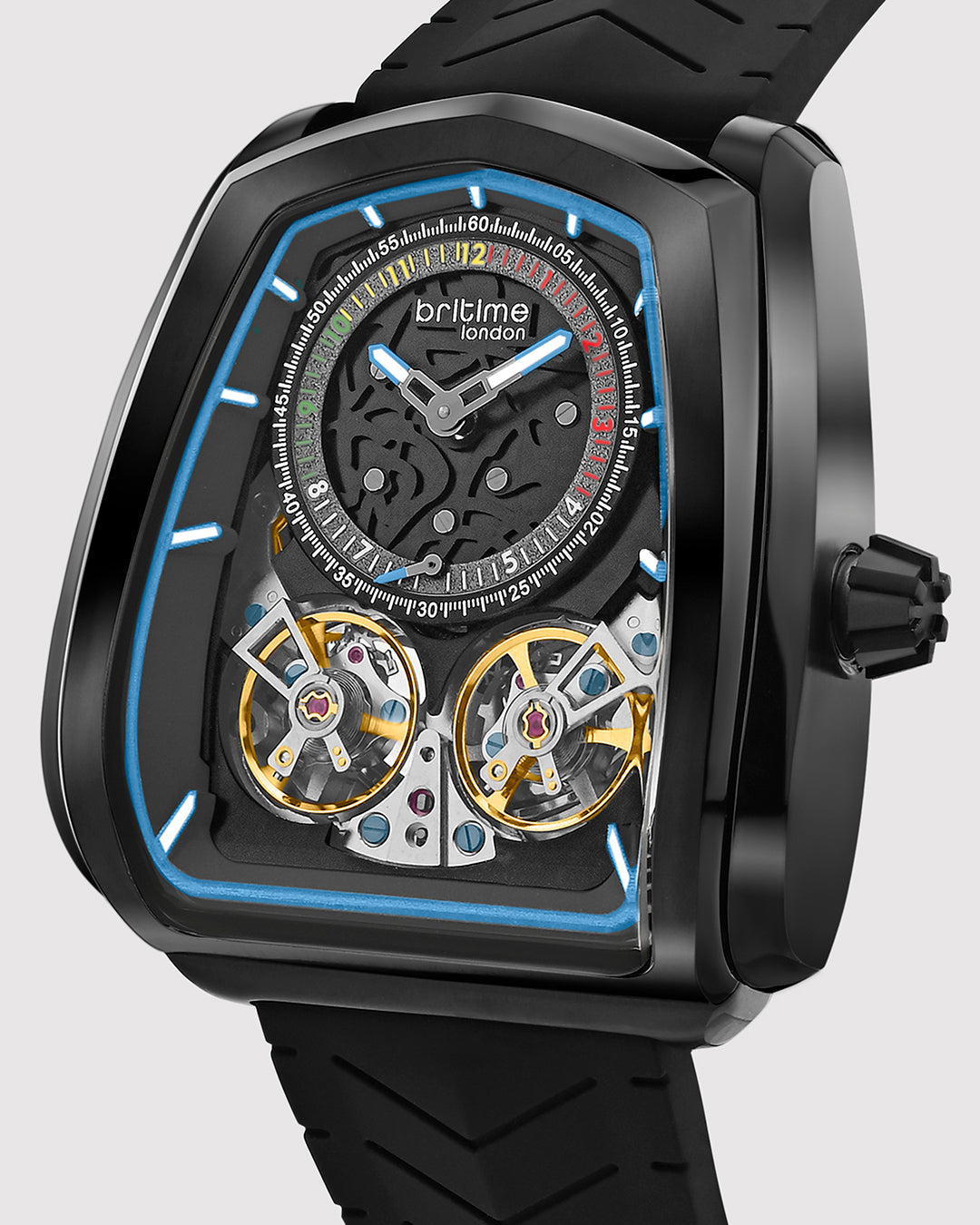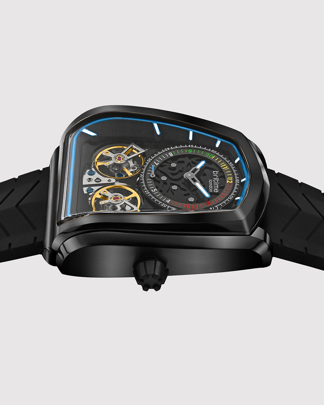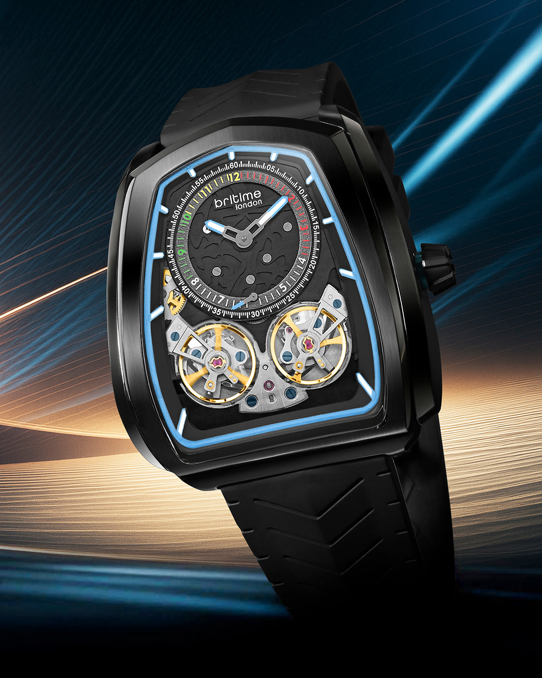 The Britime London Aventus Automatic Men’s Watch — Full Black (101-P40406) is a bold statement of modern sophistication, where cutting-edge engineering meets contemporary luxury. Defined by its distinctive tonneau-shaped silhouette, the Aventus commands attention with an architectural dial that showcases the artistry of its automatic movement. Dual exposed balance wheels, sculpted bridges, and layered construction bring the mechanics to life, creating a powerful and dynamic visual presence.