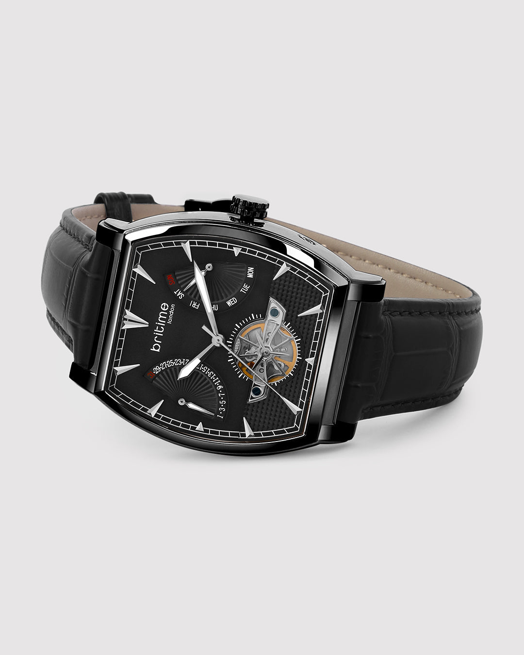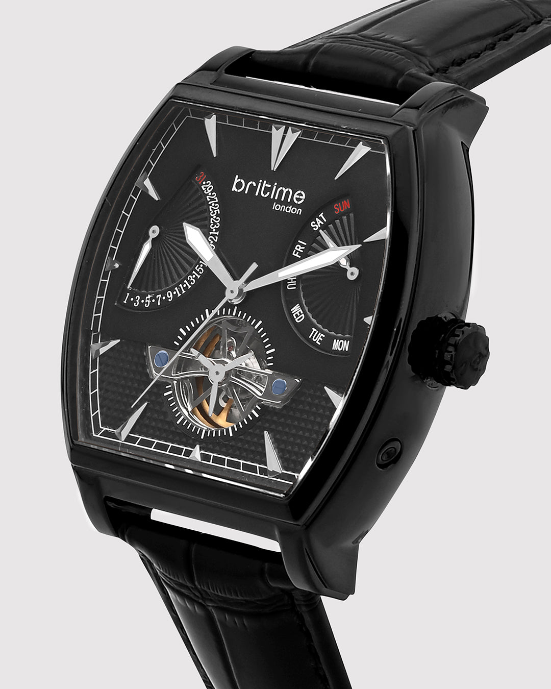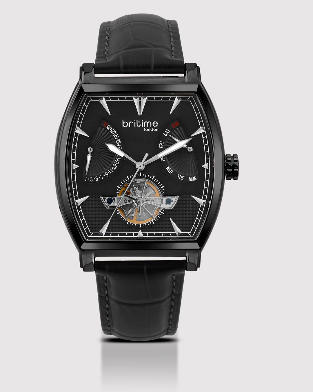 Protected by scratch-resistant sapphire glass, the Emerion showcases a durable construction with dependable automatic movement. The multi-function display enhances everyday usability, while 5 ATM water resistance ensures suitability for daily activities. Finished with a traditional pin buckle and comfortable leather strap, this Britime watch delivers timeless elegance and reliability.