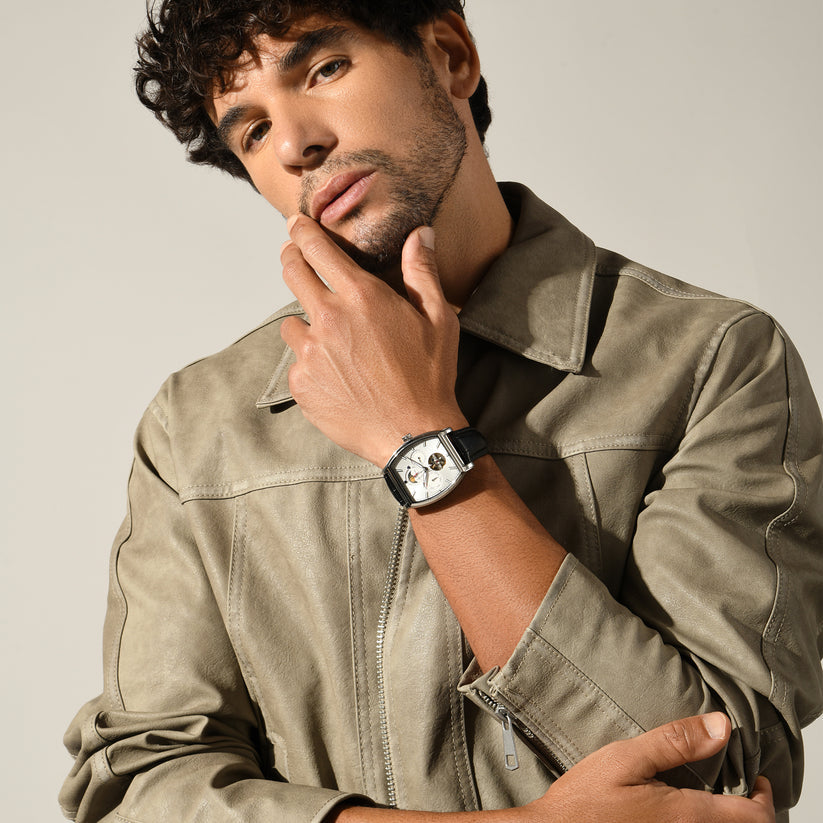 The Britime Galaxy Men Automatic Silver Dial Multi-Function Leather Watch (985-L10306) is a sophisticated timepiece combining elegance and functionality. Featuring an automatic movement, the sleek silver dial displays day, date, and moon phase complications. Its open-heart design reveals the intricate inner mechanics, while the black leather strap with a 22 mm width and 14 mm case thickness ensures comfort and durability. Crafted with a stainless steel case and 5 ATM water resistance, this watch is perfect for those seeking a bold yet timeless accessory.