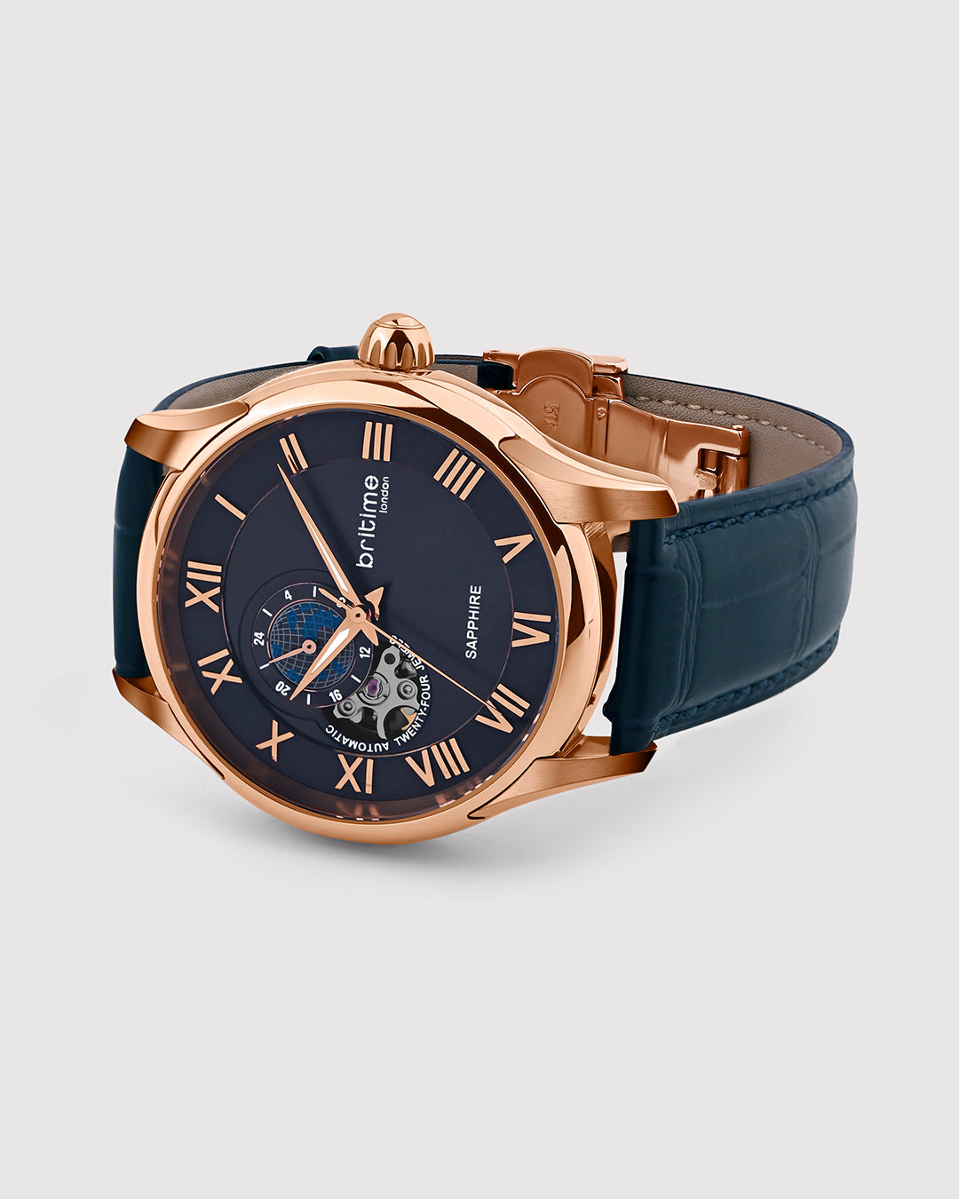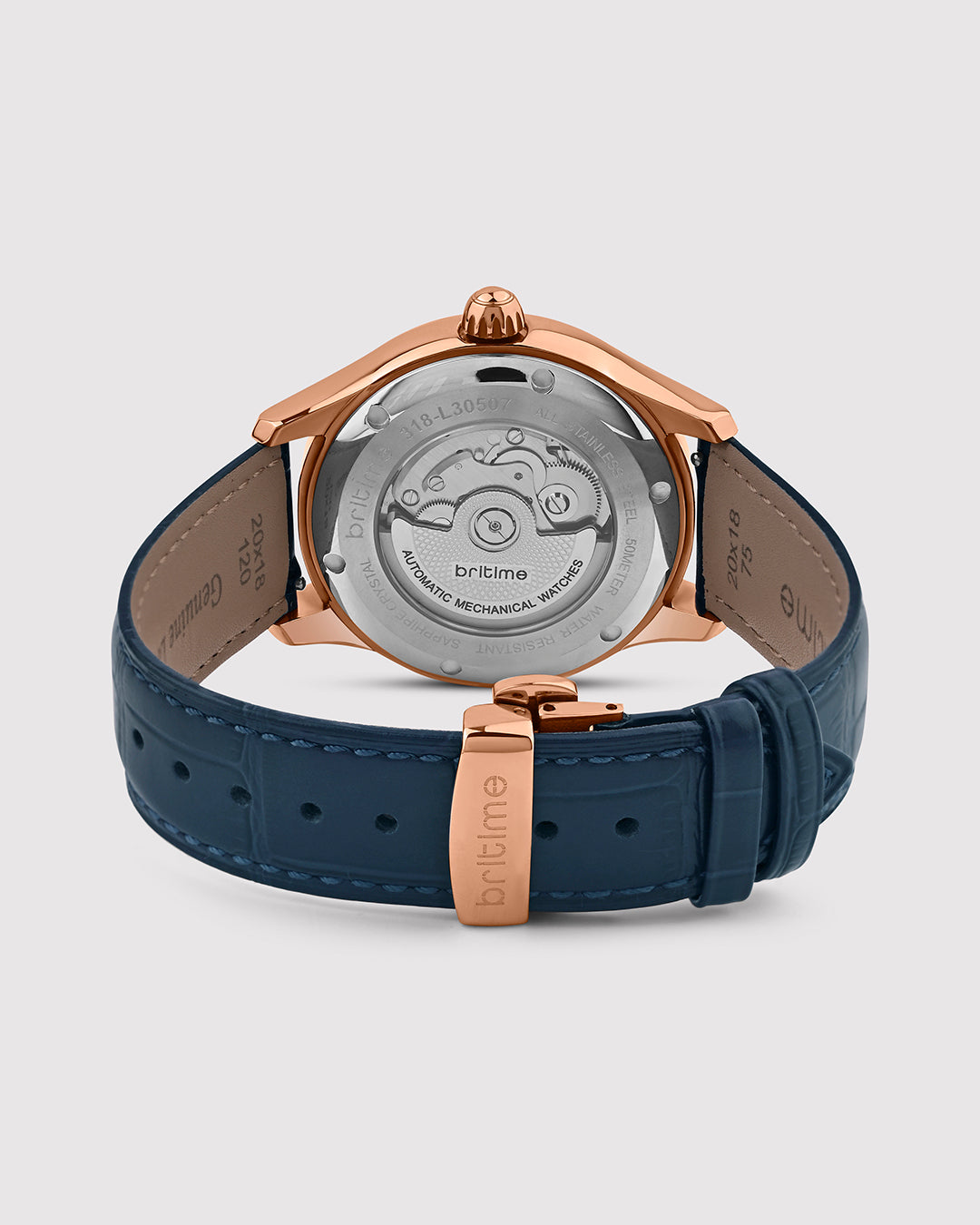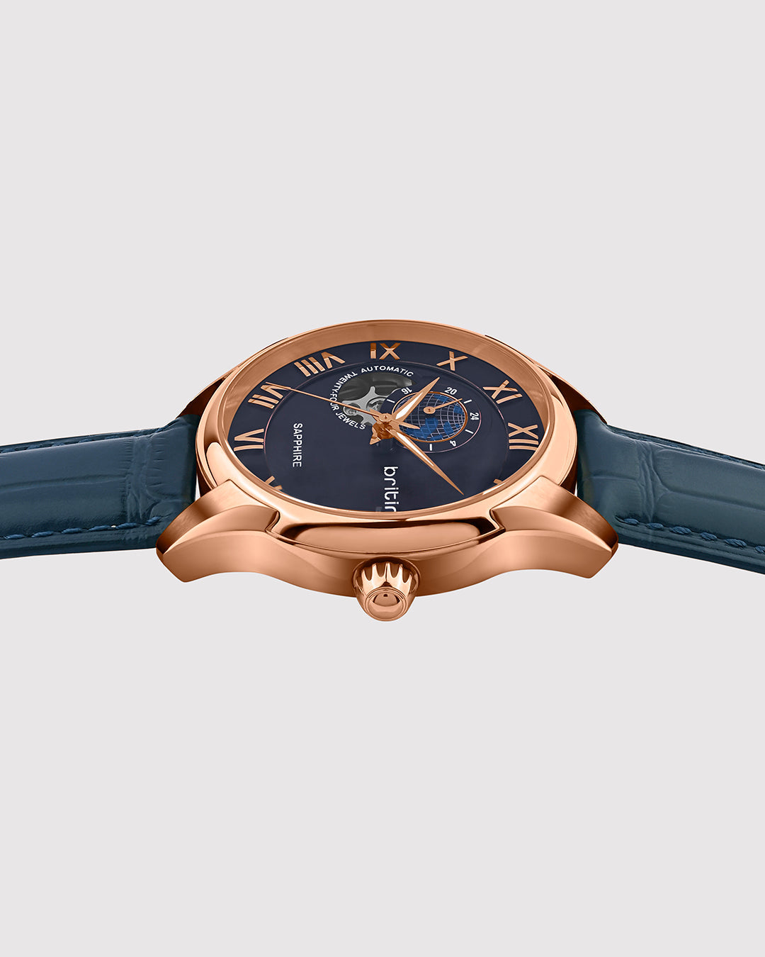 Featuring a striking blue dial with intricate detailing, the watch is paired with a matching blue leather strap for a sophisticated yet contemporary look. Protected by scratch-resistant sapphire glass and powered by a reliable automatic movement, this multi-function watch offers everyday practicality with modern luxury. With a slim profile, comfortable wear, and 5 ATM water resistance, the Britime Spiral is designed for those who move with purpose, confidence, and style.
