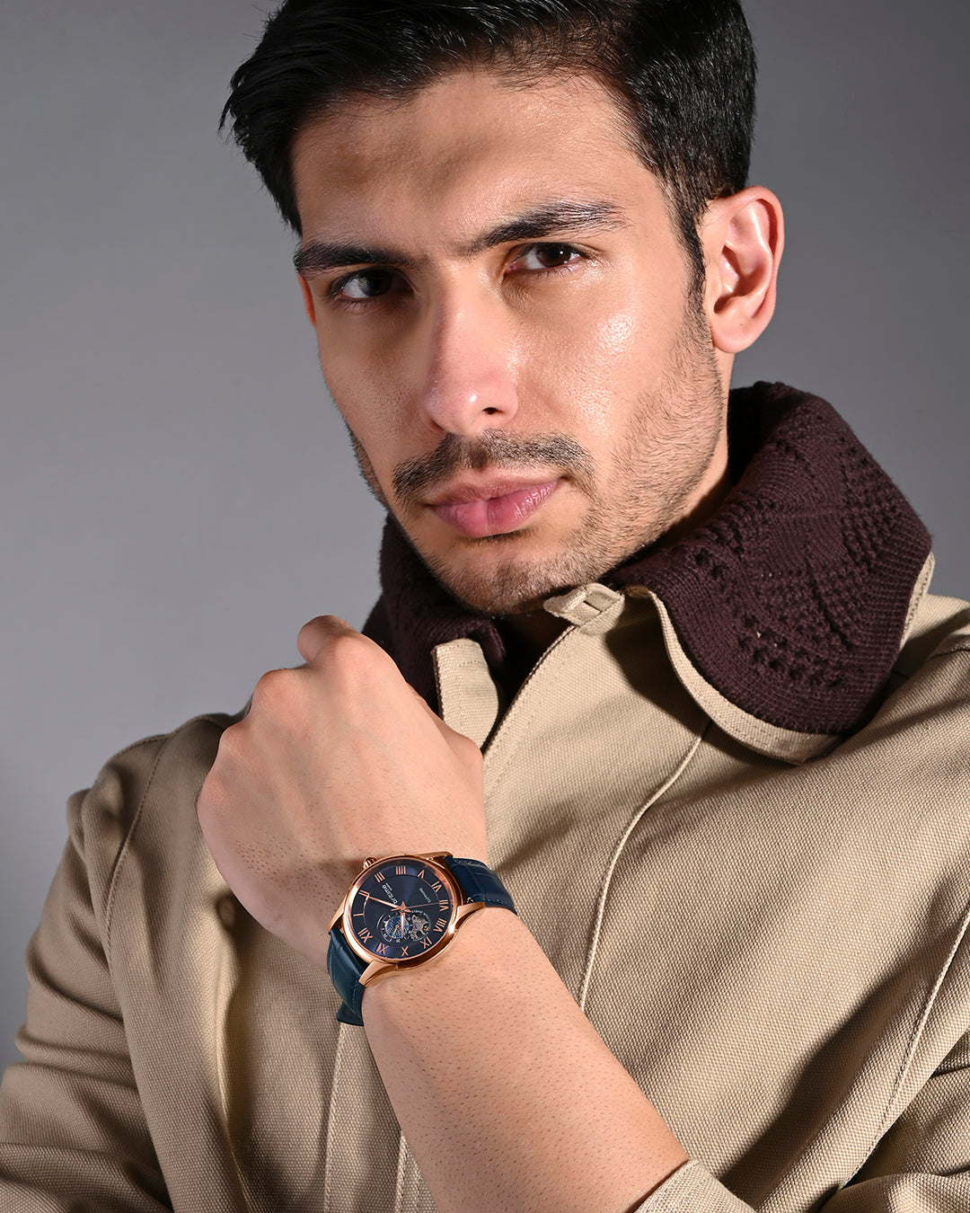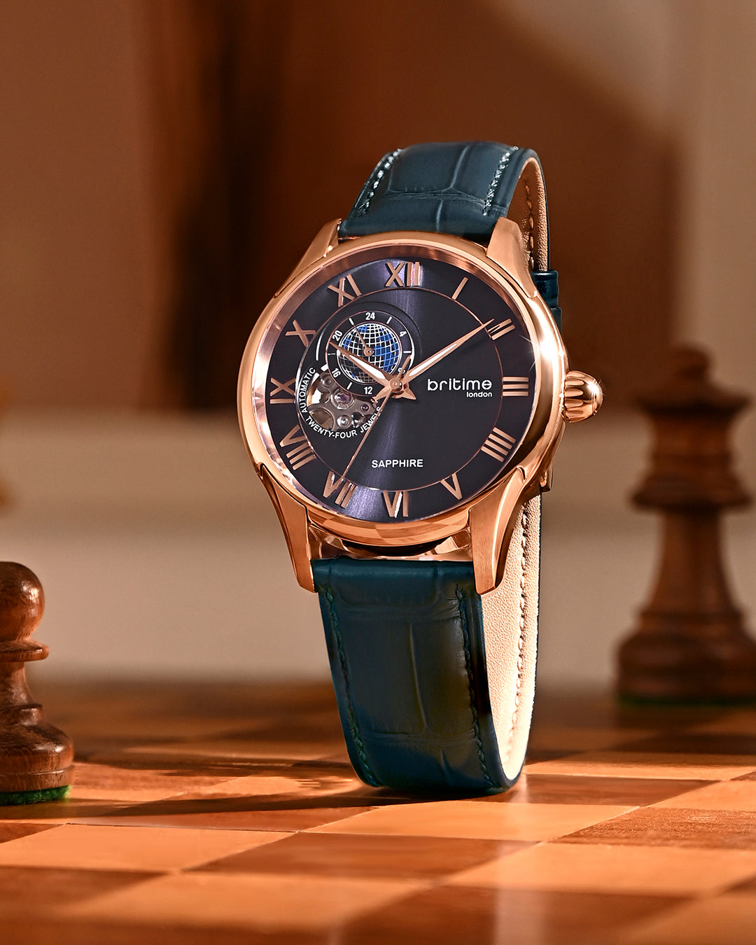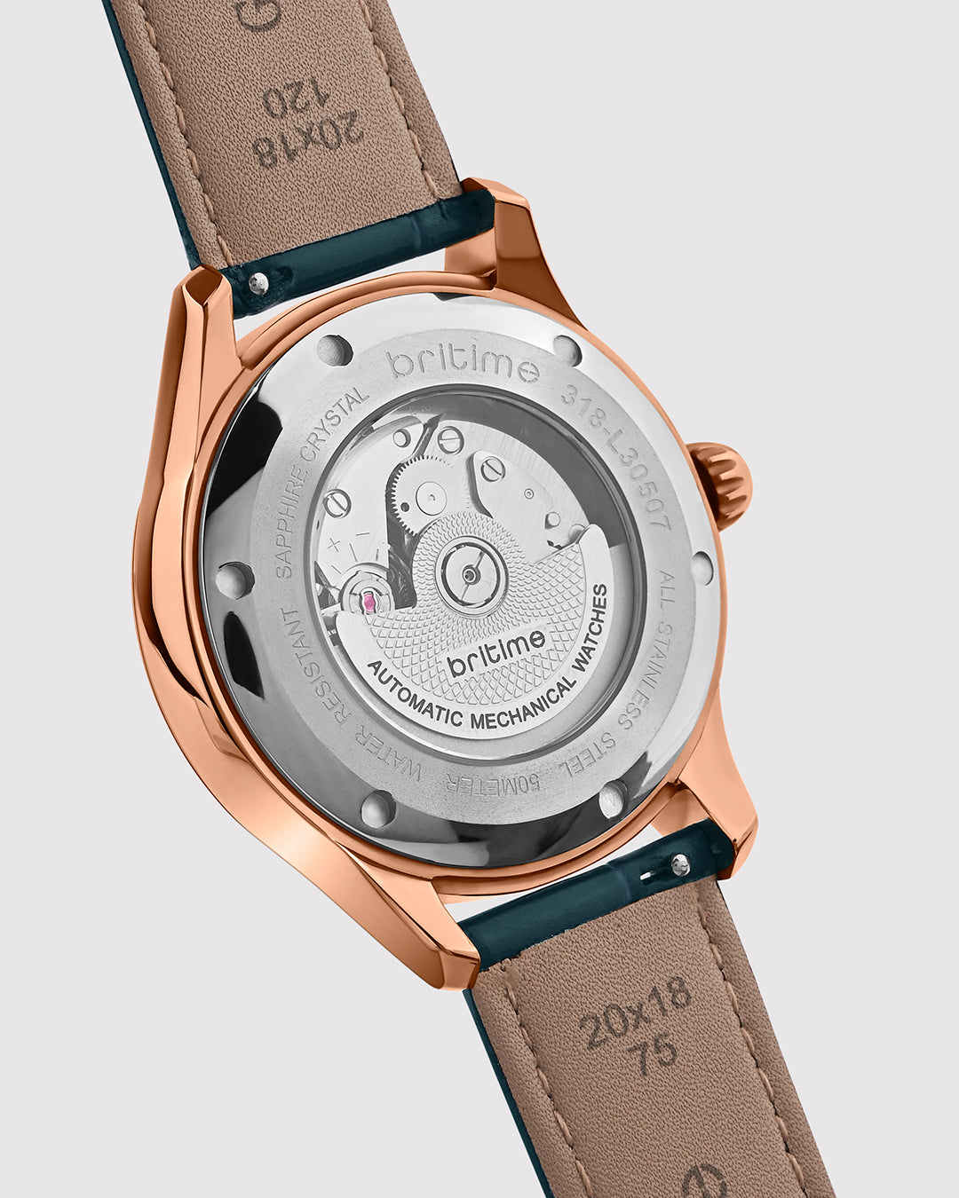 Featuring a striking blue dial with intricate detailing, the watch is paired with a matching blue leather strap for a sophisticated yet contemporary look. Protected by scratch-resistant sapphire glass and powered by a reliable automatic movement, this multi-function watch offers everyday practicality with modern luxury. With a slim profile, comfortable wear, and 5 ATM water resistance, the Britime Spiral is designed for those who move with purpose, confidence, and style.