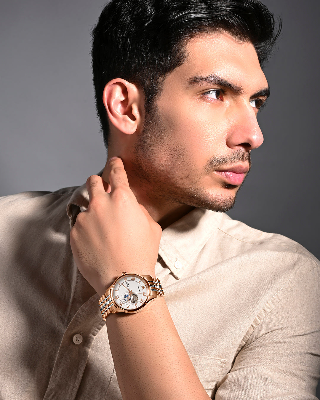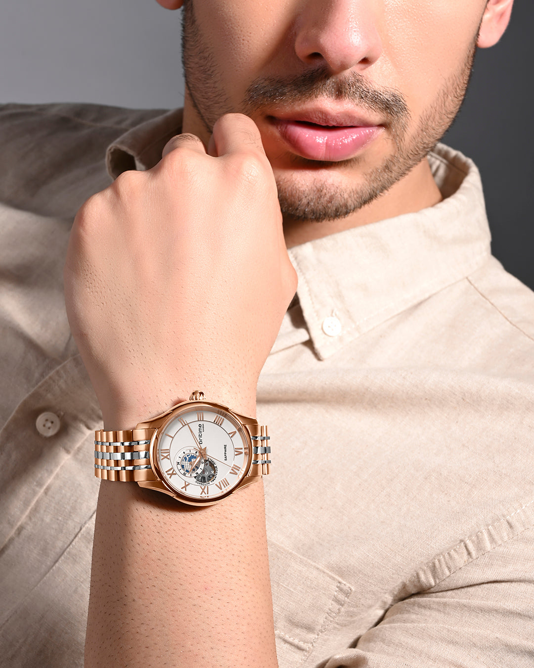 The Britime Men’s Automatic Analog Metal Watch (318-M30205) is a refined timepiece that blends contemporary styling with dependable mechanical performance. Designed for men who appreciate understated elegance, this watch features a clean silver dial paired with a distinctive two-tone metal bracelet, making it suitable for both formal and everyday wear.