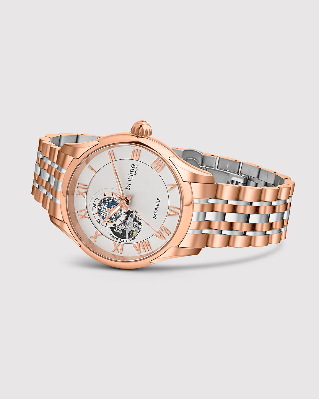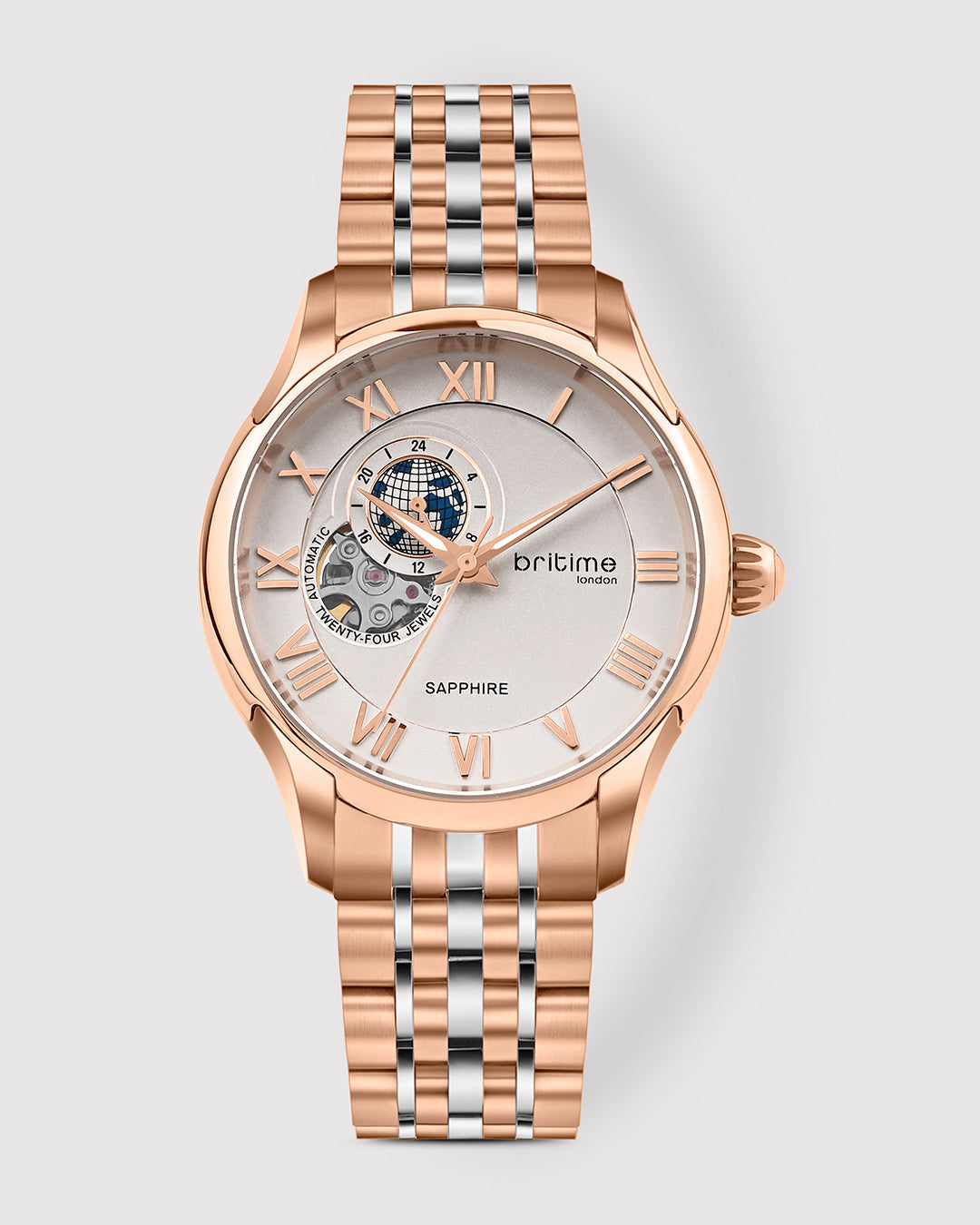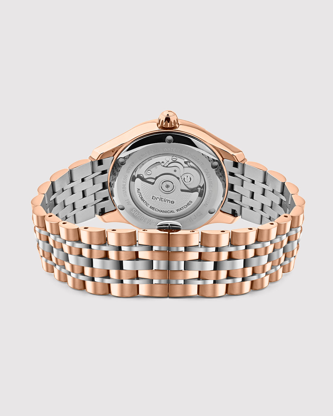 Built with durability in mind, the watch is protected by scratch-resistant sapphire glass and powered by a reliable automatic movement. Its slim 9 mm case thickness ensures a comfortable fit under cuffs, while 5 ATM water resistance adds practicality for daily use. Finished with a secure butterfly clasp, this Britime watch delivers timeless style with modern reliability.