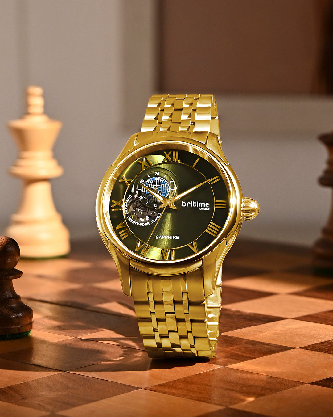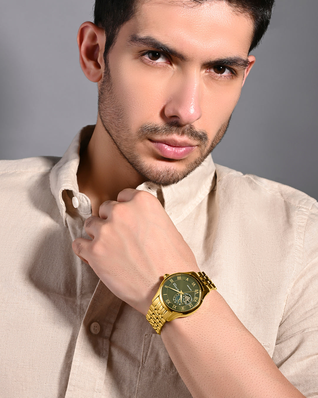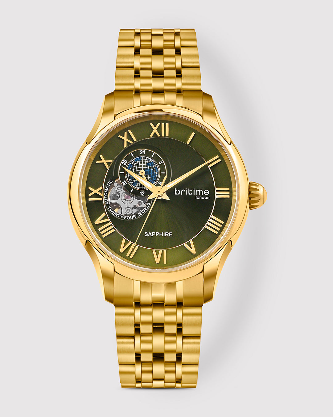 The Britime Men’s Automatic Analog Metal Watch (318-M21402) is a bold yet refined timepiece designed for men who appreciate distinctive style with mechanical precision. Featuring a rich green dial paired with a striking gold-tone metal bracelet, this watch offers a confident look suitable for both formal occasions and everyday wear.