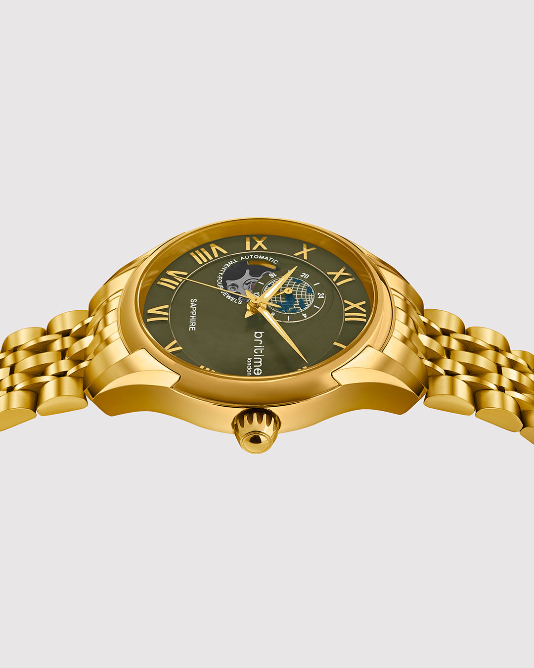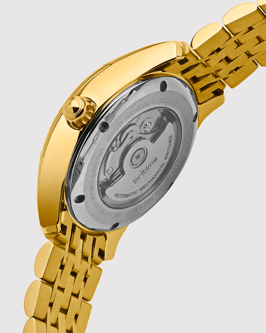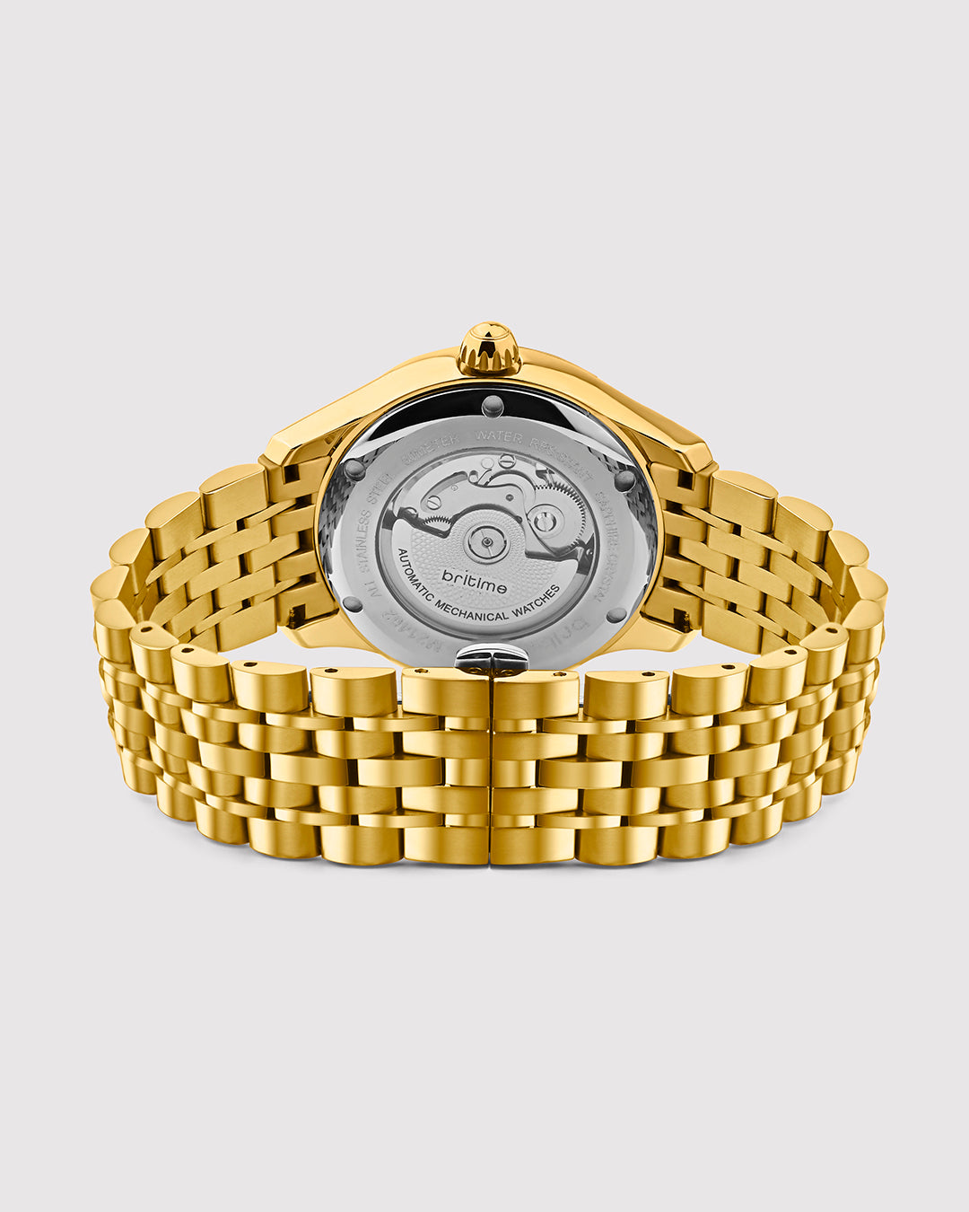 Protected by scratch-resistant sapphire glass, the watch is powered by a reliable automatic movement and features a slim 9 mm case thickness for comfortable all-day wear. With 5 ATM water resistance and a secure butterfly clasp, this Britime timepiece combines elegance, durability, and modern craftsmanship.