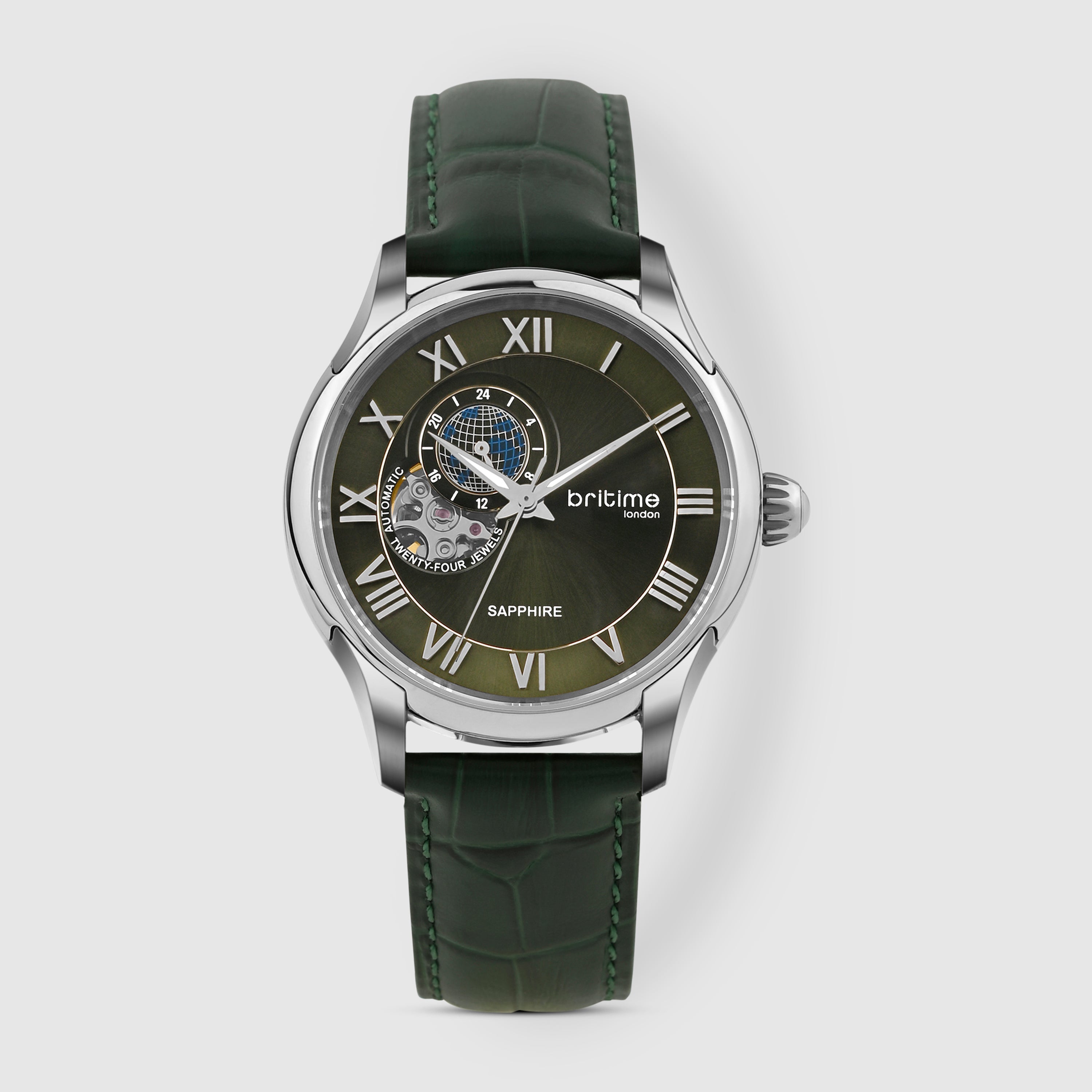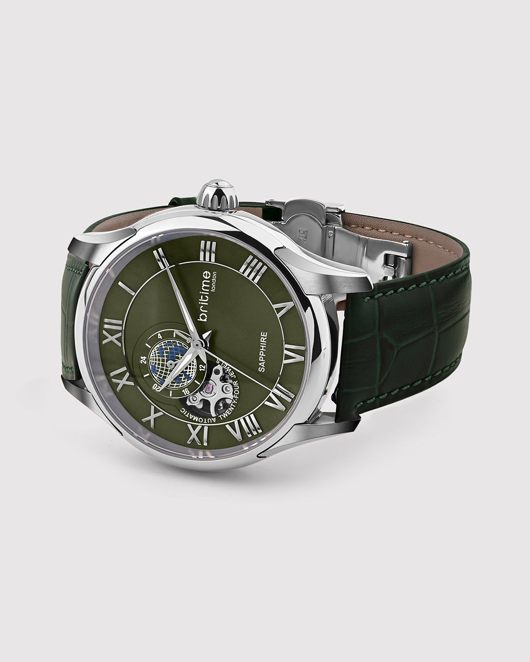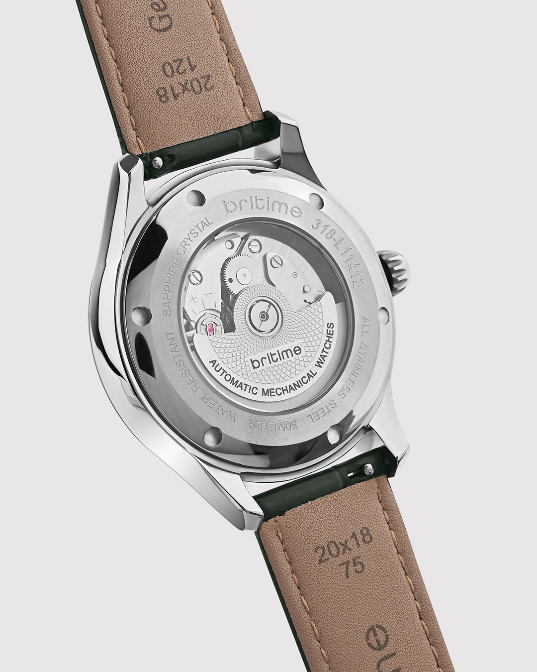 Protected by scratch-resistant sapphire glass, the Windsor is powered by a dependable automatic movement and features a slim 9 mm case thickness for superior comfort. With 5 ATM water resistance and a traditional pin buckle closure, this Britime timepiece offers understated sophistication with practical durability.