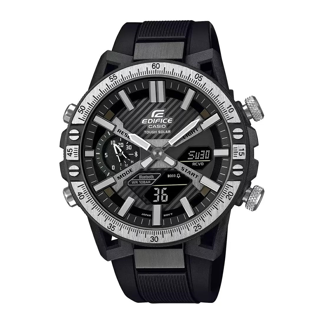 The EDIFICE ECB-2000TP-1ADF is a Black Bluetooth Connect Men's Watch with Tough Solar technology, world time across 38 time zones, and Bluetooth mobile link for easy time adjustment and watch settings.