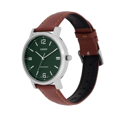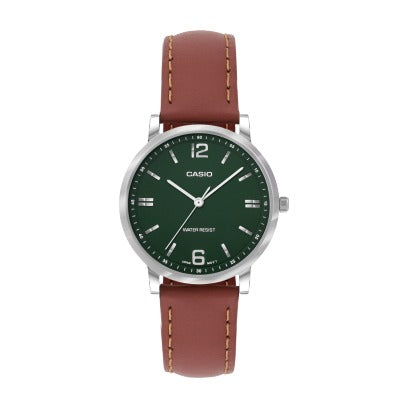 The Casio LTP-SN5YL-3A is an elegant women’s analog timepiece that showcases refined simplicity and timeless design. Featuring a gold ion-plated case, genuine leather strap, and a soft green dial, this watch exudes charm and sophistication. Lightweight and comfortable, it offers reliable quartz precision and classic styling suitable for everyday wear or special occasions.