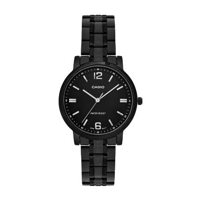The Casio LTP-SN5YB-1A is a sleek and modern women’s analog watch designed with a striking all-black finish. Featuring a black ion-plated case and stainless steel band, this timepiece offers both elegance and durability. Its minimalist dial, quartz precision, and lightweight build make it an ideal choice for those who appreciate contemporary style and everyday functionality.