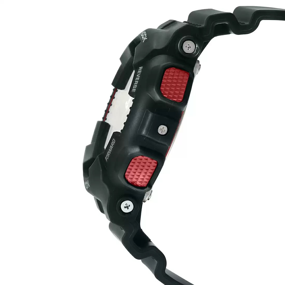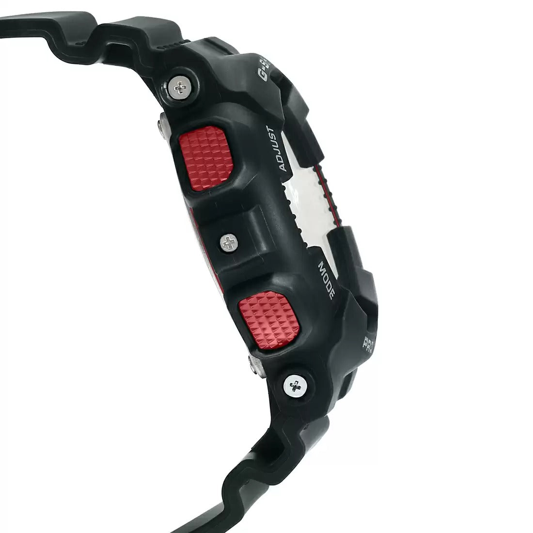 The G-SHOCK GA-100-1A4DR - G272 is a bold Black Analog-Digital Men's Watch, designed for durability and advanced performance with a sporty red accent.