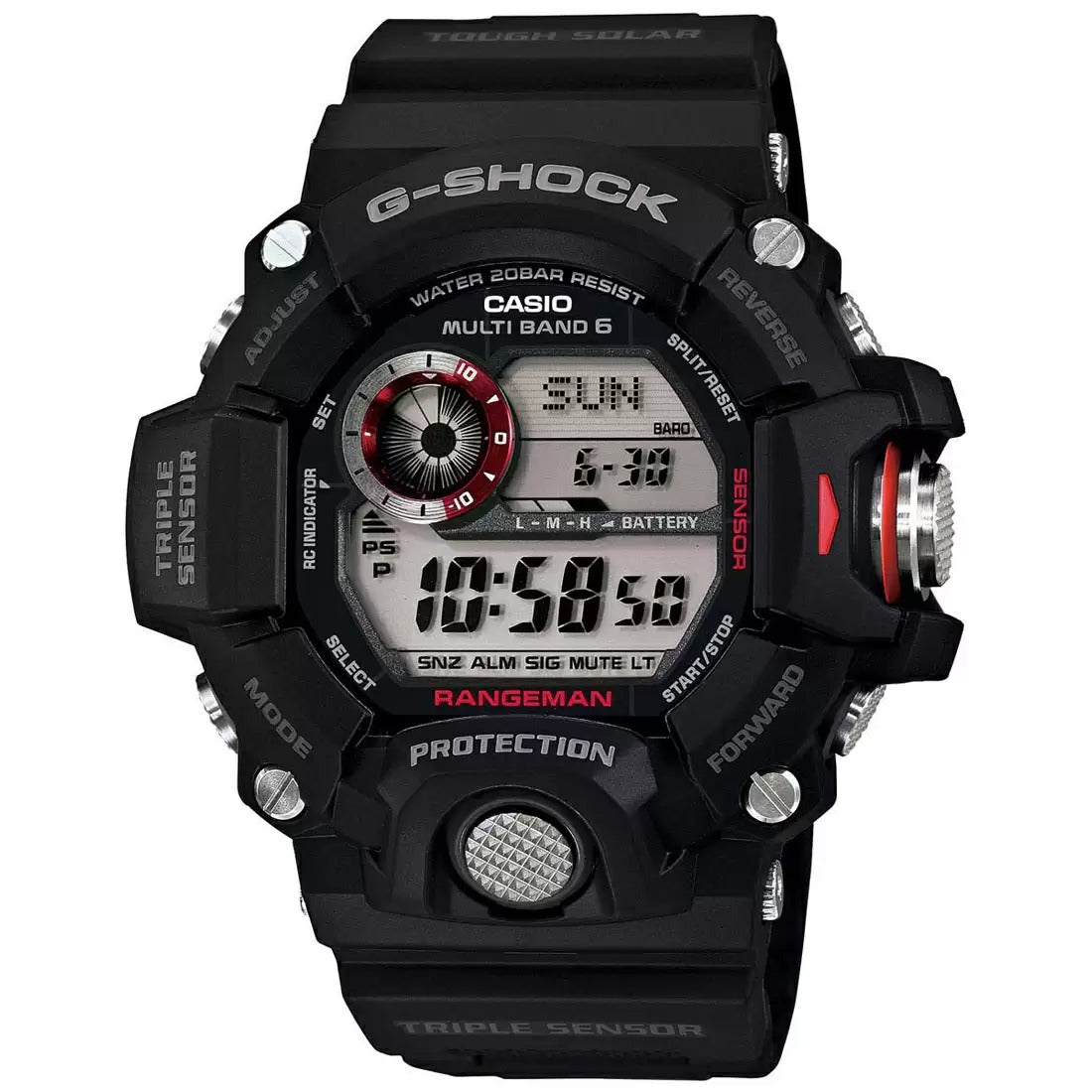 The G-SHOCK GW-9400-1DR MOG Rangeman is an advanced digital men's watch designed with Triple Sensor technology, providing high-precision detection of environmental factors such as temperature, pressure, and altitude. This rugged watch is perfect for adventurers who require reliable data during extreme conditions.