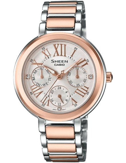 The Casio SHE-3034SPG-7AUDR from the Sheen collection is a refined women's analog watch that blends luxury with utility. Adorned with Swarovski elements, this timepiece features a gold dial housed in a stainless steel case, complemented by a stylish rose gold, silver, and white band. It offers day, date, and 24-hour time functionality for everyday sophistication.