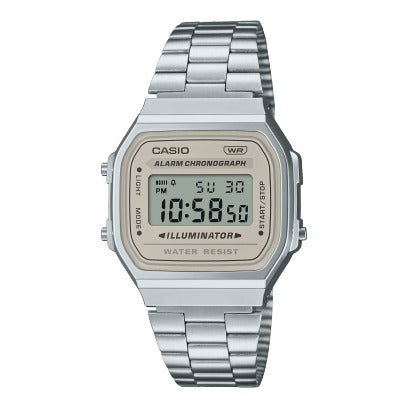 The Casio A168WA-8AY (D332) delivers timeless appeal with a low-key classic look, pairing a subdued colour scheme with an understated square design. Clean lines and a compact profile make this digital icon an effortless choice for everyday wear, whether styled casually or with smart outfits.