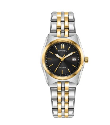 A classic timepiece is always in style in the Corso women’s watch from Citizen. Featuring a two-tone gold and silver-tone stainless steel bracelet and case with a 3-hand white dial and date indicator, luminous hands and gold-tone markers. This elegant timepiece also features a fold-over clasp closure with hidden push buttons and is water resistant to 100 meters. If you’re looking for a dress watch to add effortless style to your wardrobe, the Corso is the perfect choice. It also uses Citizen’s proprietary Eco-Drive technology, so it is sustainably powered by any light and will never need a battery. Caliber number E011.