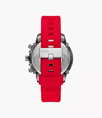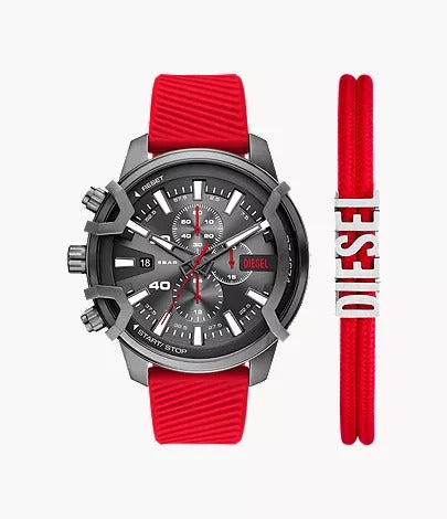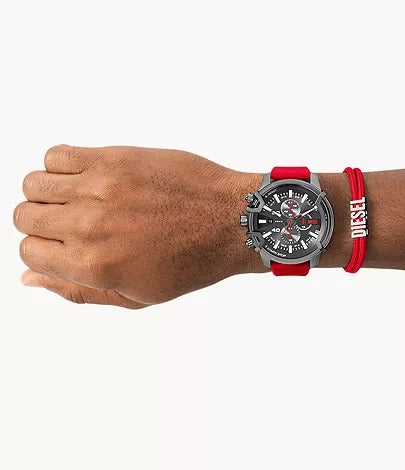 The Diesel Griffed Chronograph Red Silicone Watch and Nylon Bracelet Set (DZ4673SET) is a bold and sporty gift set designed for modern men. Featuring a 48 mm Griffed chronograph watch with a striking black dial and gunmetal stainless steel case, this set combines rugged style with precise functionality. The red silicone strap ensures comfortable daily wear, while the included red nylon bracelet adds a casual, layered look. Powered by reliable quartz chronograph movement, protected by mineral glass, and water-resistant up to 5 ATM, this set is perfect for both everyday adventures and statement-making style.