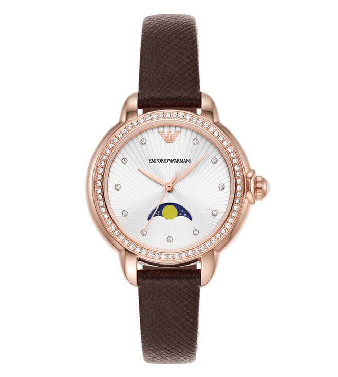 Amaze everyone around you by wearing this women's analog watch from Emporio Armani. The silver round dial is protected by a mineral glass. It has a crown for time adjustment. The genuine leather strap comes in a brown hue that further elevates the look of the timekeeper. Besides, it is completed with a deployment clasp to ensure a secure fit on the wrist.