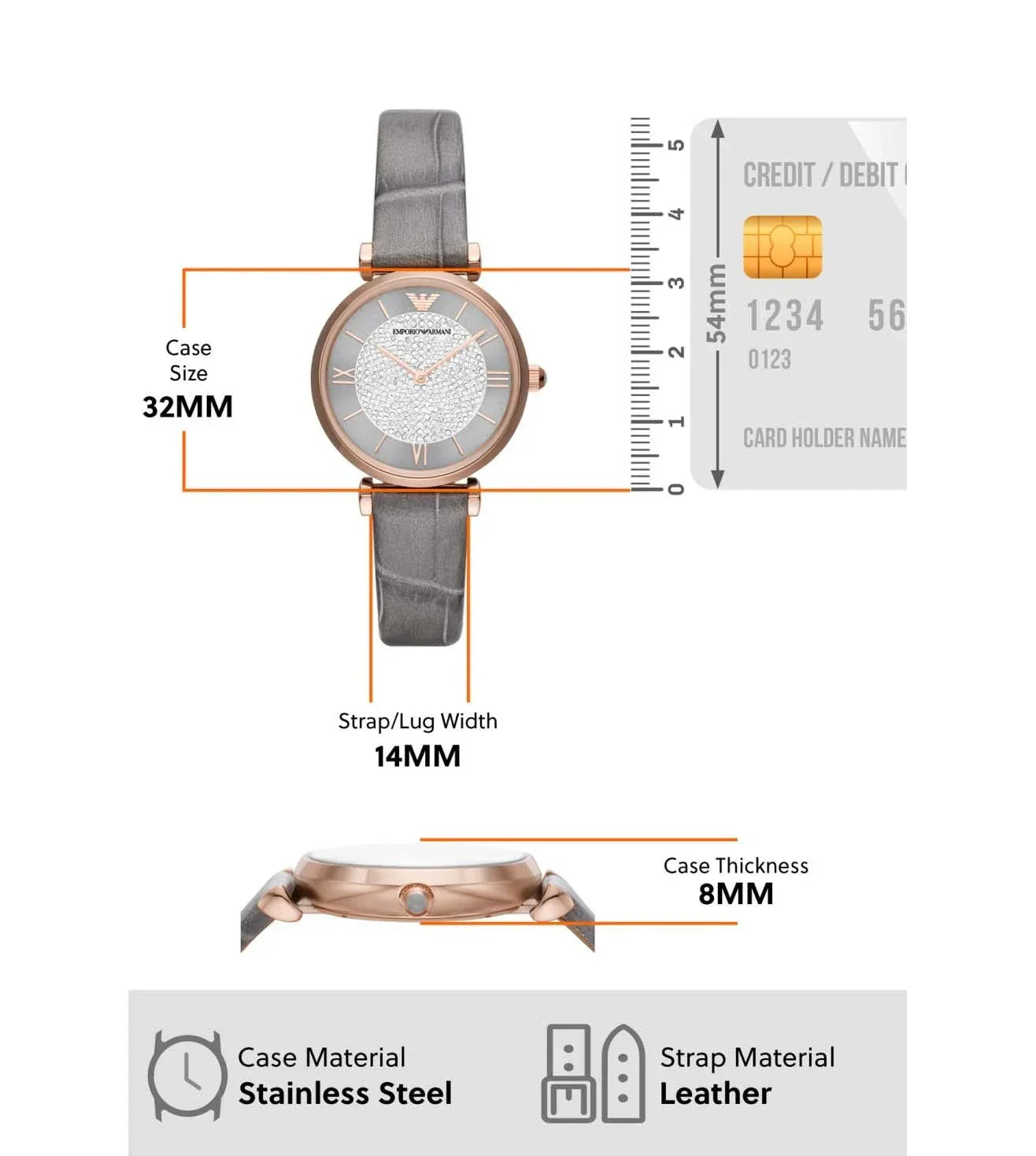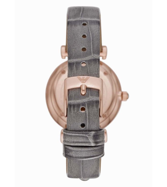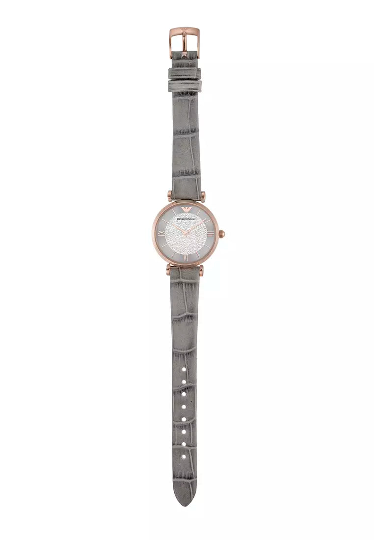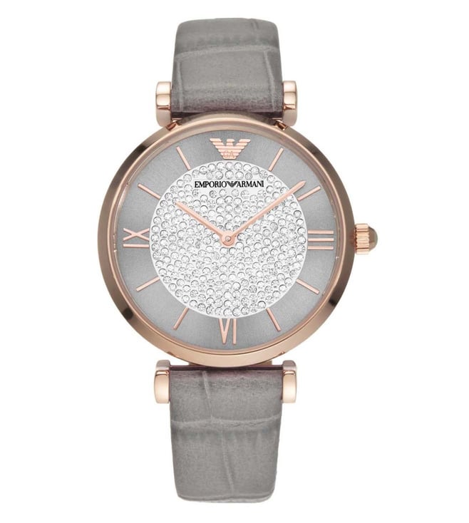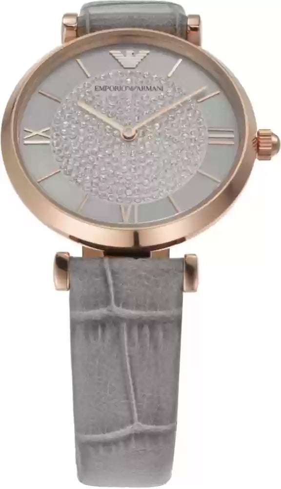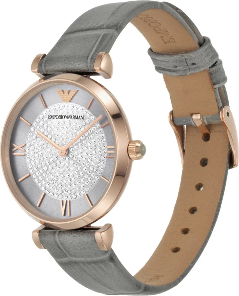 Add a perfect finishing touch to your look with this watch from Emporio Armani. Safeguarded by mineral glass and functional on a quartz movement, the round-shaped sunray dial with full pave is encompassed in a 32 mm case. It exudes plain 2-hand functionality and is water resistant up to 30 m. Furthermore, it is complemented with a buckle clasp that ensures a secure fit on the wrist.