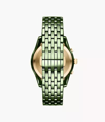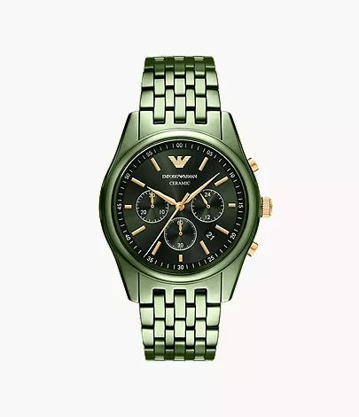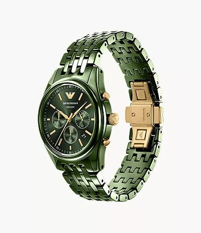 The Emporio Armani Chronograph Green Ceramic Watch (AR70017) combines bold design with refined craftsmanship. Featuring a 43 mm green ceramic case, matching green dial, and ceramic bracelet, this timepiece makes a striking statement. Powered by a reliable quartz chronograph movement, it offers precise timekeeping and functionality, while the mineral crystal ensures durability. With 5 ATM water resistance and a secure butterfly deployant clasp, this watch balances performance with sophistication.