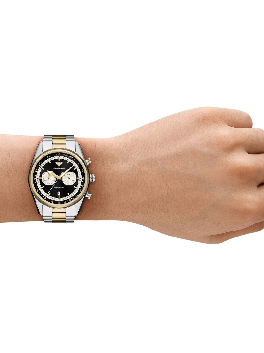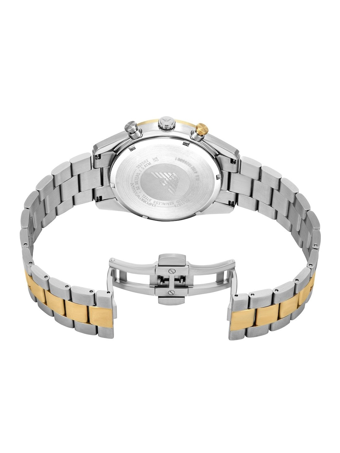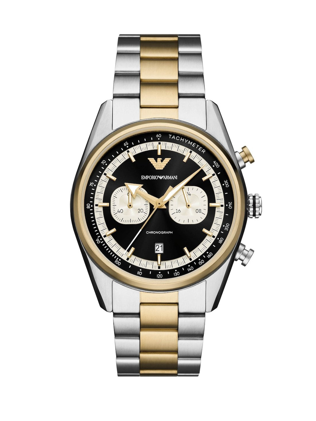 The Emporio Armani Chronograph Men's Watch - AR11678 exudes contemporary style with a 42mm stainless steel case and a striking black sunray dial with white subdials. Featuring a precise quartz chronograph movement, this watch is paired with a two-tone stainless steel bracelet in brushed pale gold and silver, delivering a masculine yet refined look suitable for both work and leisure.