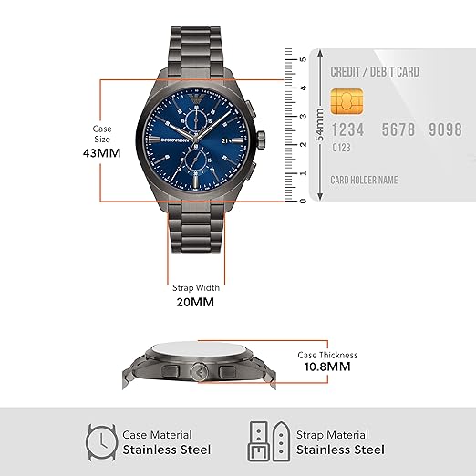 Lending a contemporary twist to an elegant design, this men analog watch from Emporio Armani is a must-have wrist essential. Its strap comes in a shade of black that elevates the look of the watch. The navy round dial is secured by a mineral glass and is housed in a case. It exudes chronograph, and a crown for time adjustment. Furthermore, it is completed with a jewellery clasp clasp to ensure a secure fit on the wrist.