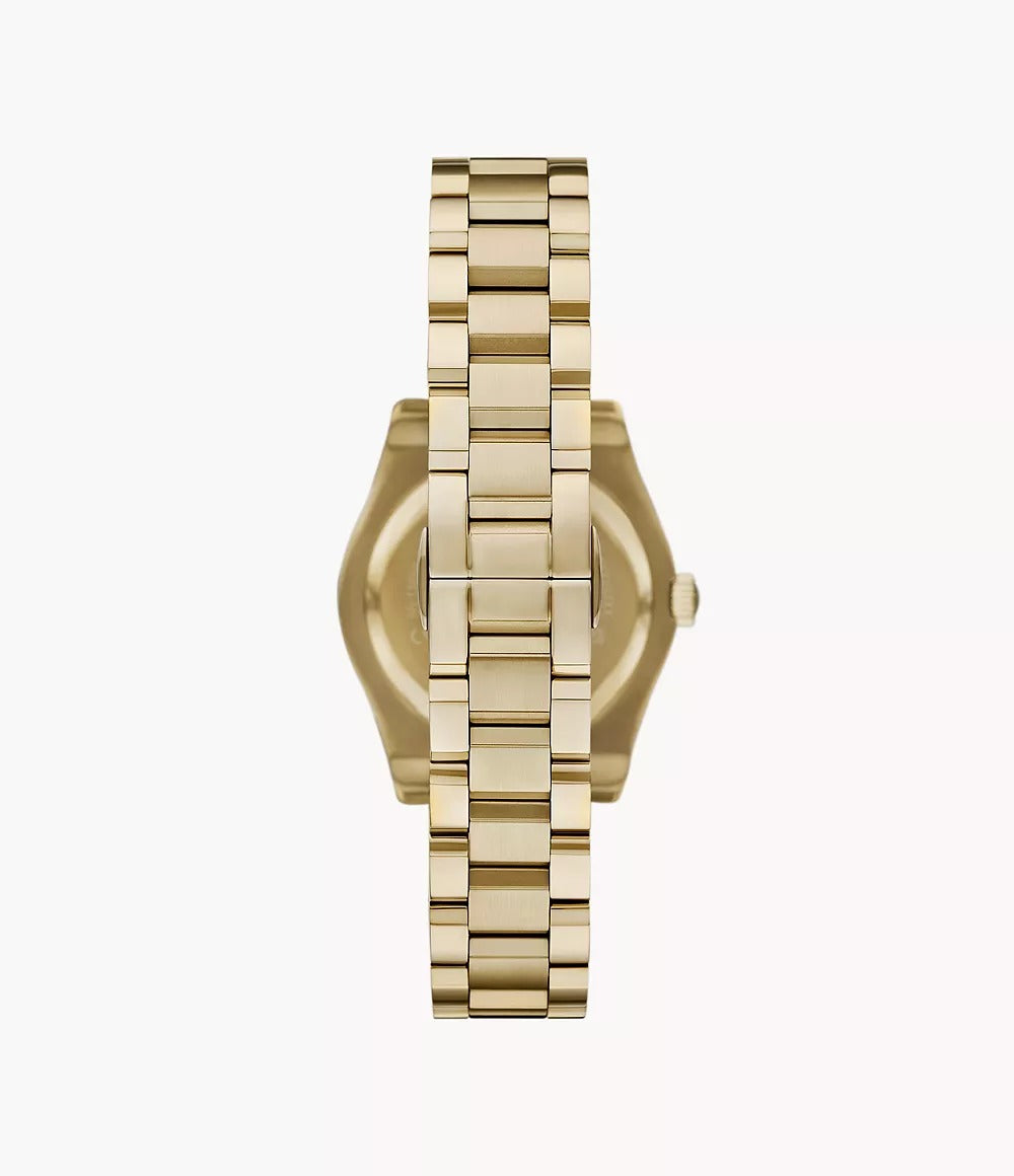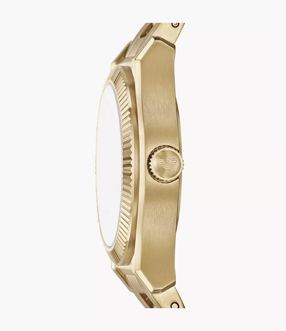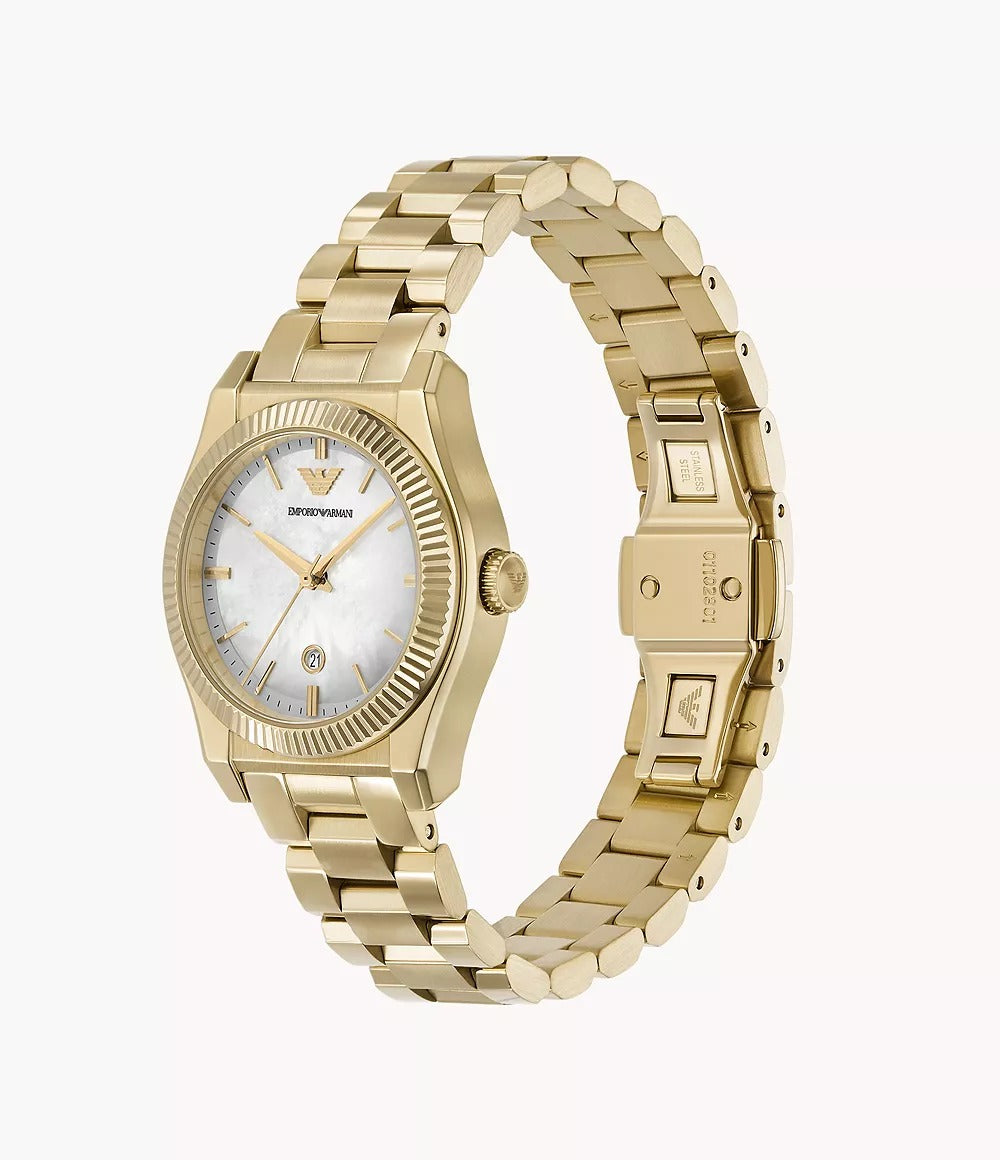 The Emporio Armani Women's Watch - AR11657 combines elegance and sophistication with a 32mm case and a glossy white mother-of-pearl dial. Featuring a three-hand date quartz movement, this timepiece is complemented by a gold-tone stainless steel bracelet and a fluted bezel for added style. Perfect for daily wear or special occasions, it blends classic design with modern refinement.