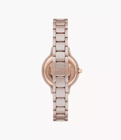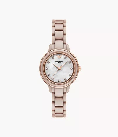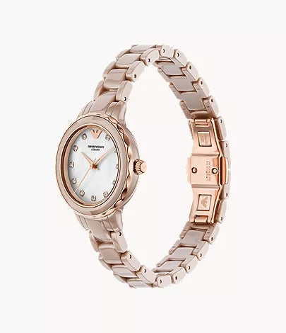 The Emporio Armani Three-Hand Sand Ceramic Watch (AR70018) showcases elegance in its purest form. Featuring a 32 mm nude ceramic case with a stunning mother-of-pearl dial, this timepiece radiates sophistication. The taupe ceramic bracelet with butterfly deployant closure ensures comfort and durability, while the mineral crystal offers protection. Powered by precise quartz movement and designed with 5 ATM water resistance, it is a refined accessory for everyday wear or special occasions.