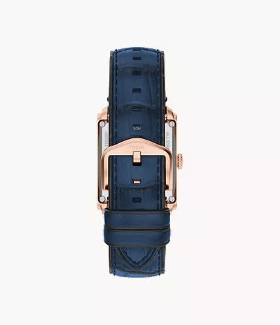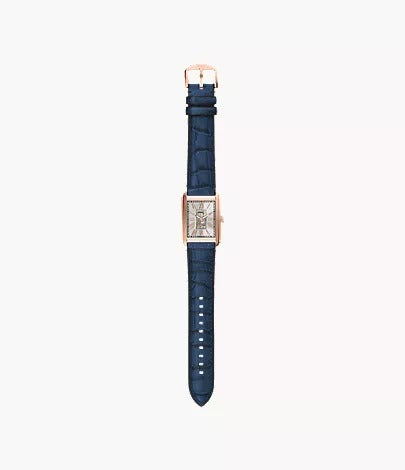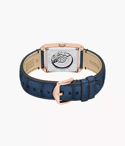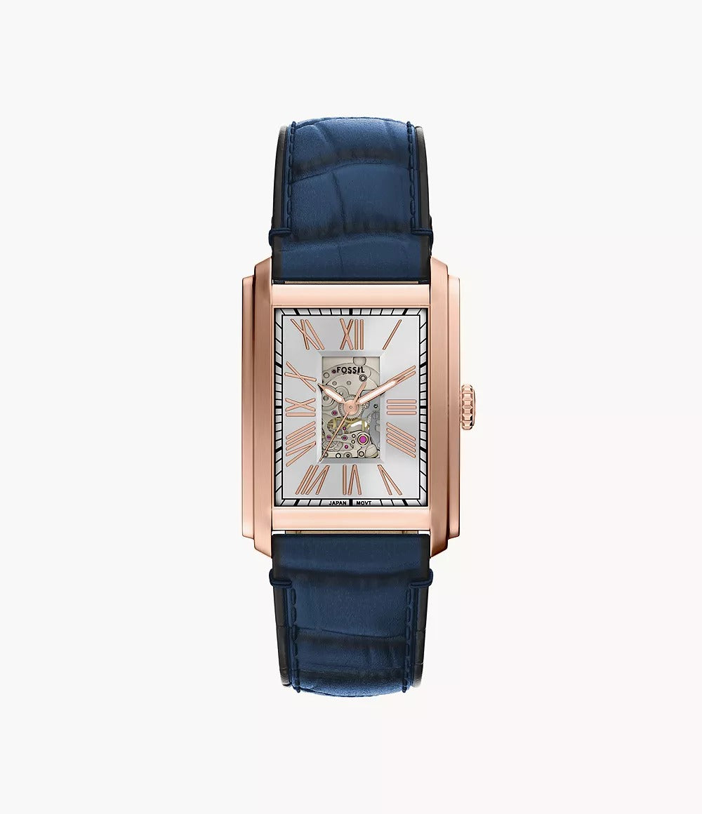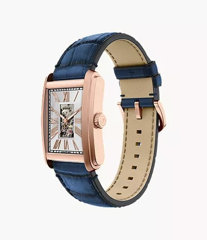 The Fossil ME3274 Carraway Automatic Men's Watch is a refined blend of classic styling and modern craftsmanship. Its white silver skeletonized dial and open caseback beautifully showcase the automatic movement, offering both visual intrigue and functional elegance—without the need for a battery. The rose-gold stainless steel case is gently curved for wrist comfort, while the navy croco-embossed leather strap with soft nubuck lining provides a luxurious, timeless appeal. Designed with attention to every detail, this watch is perfect for those who appreciate sophistication and mechanical artistry.