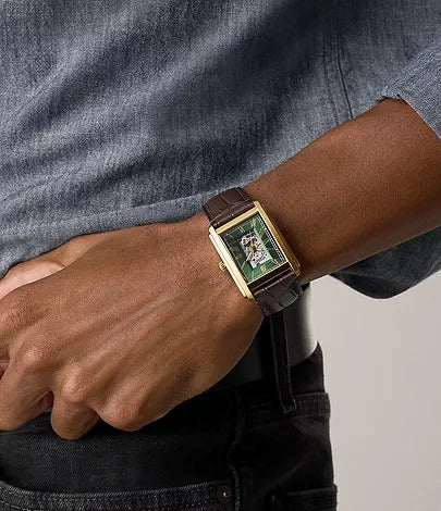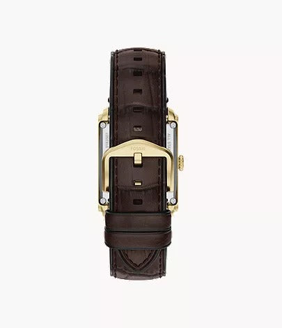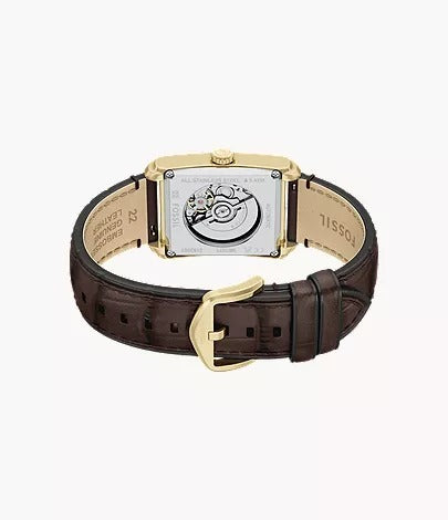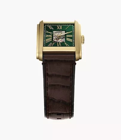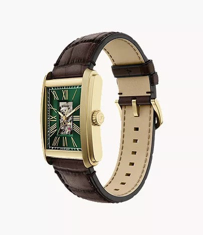 The Fossil ME3271 Carraway Automatic Men's Watch blends timeless elegance with refined mechanical design. Its green skeletonized dial and open caseback reveal the automatic movement, offering a perfect balance of visual sophistication and technical craftsmanship—without the need for a battery. The gold-tone stainless steel case is curved for enhanced wrist comfort, while the brown croco-embossed leather strap with soft nubuck lining adds a luxurious, classic finish. A thoughtfully designed timepiece, it delivers both style and enduring appeal.