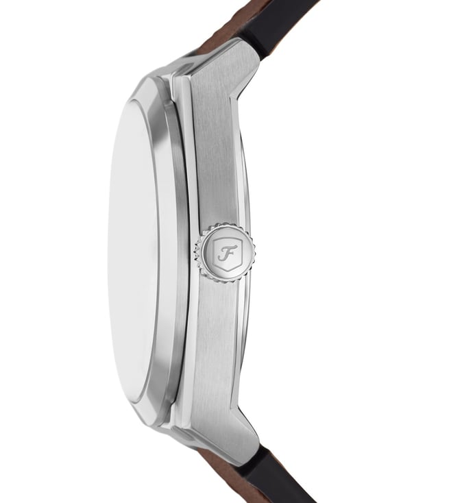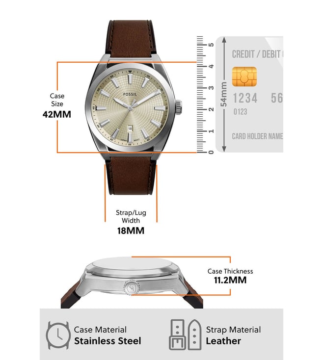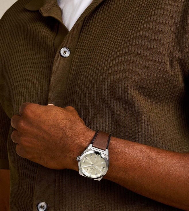 This 42mm Everett watch features a cream sunray dial with a three-hand date movement and a classic brown leather strap. Its elegant design combines functionality with a sophisticated, timeless look.