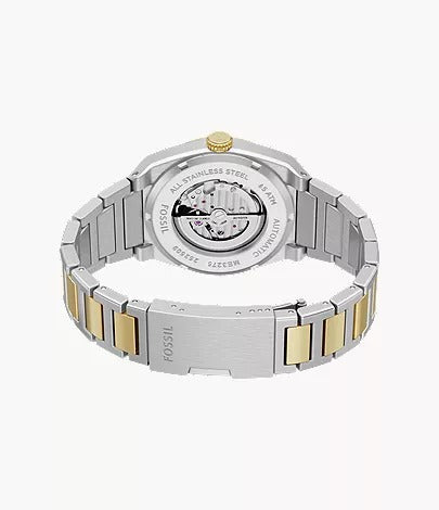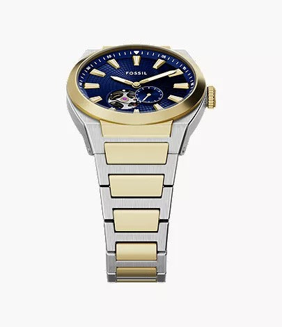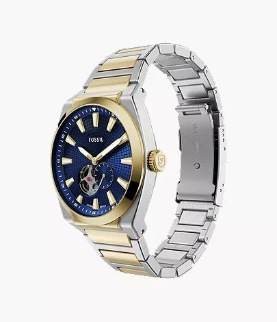 The Fossil ME3275 Everett Automatic Men's Watch combines modern appeal with reliable engineering. Its 42 mm stainless steel case pairs with a striking blue dial that highlights the open-heart automatic movement—powered without a battery. The two-tone stainless steel strap adds a premium, stylish finish, while the mineral crystal ensures durability against daily wear. With 50 m water resistance and essential hour, minute, and small-second functions, this timepiece is perfect for those who value craftsmanship and contemporary design.