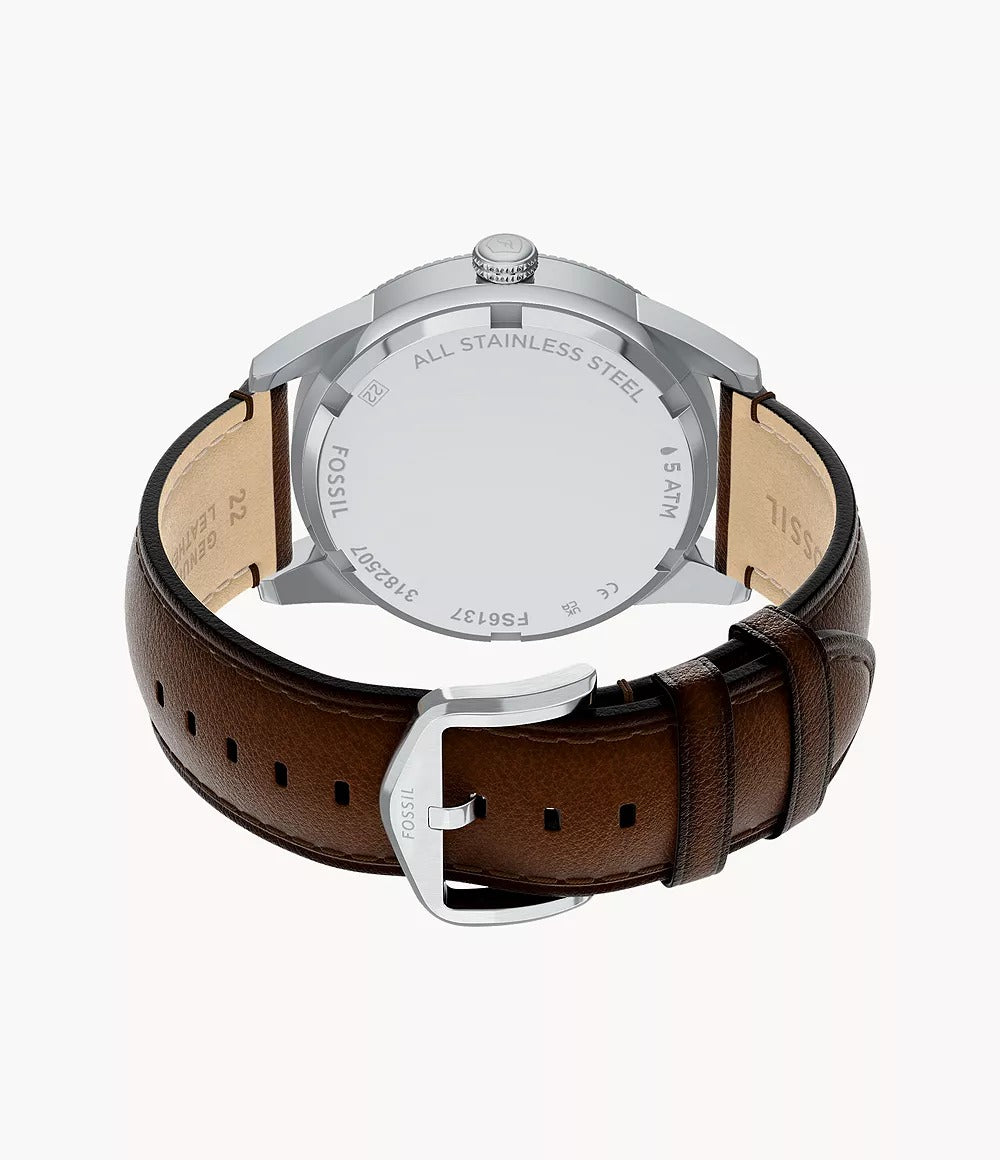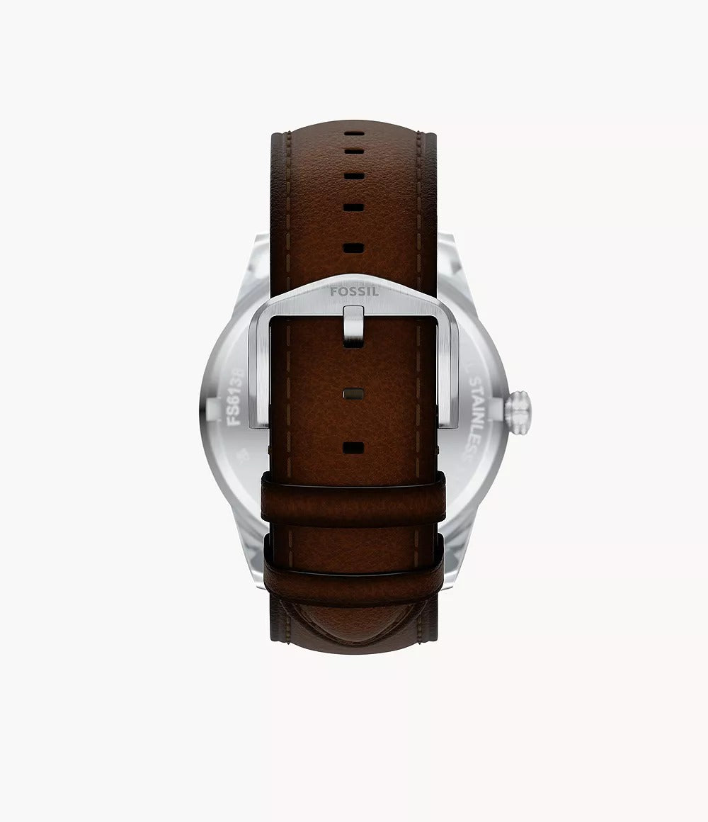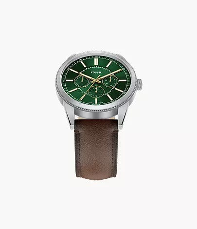 The Fossil FS6137 Pearson Multifunction Brown Leather Watch blends polished craftsmanship with everyday versatility. Its stainless steel-tone case frames a striking green sunray dial, offering depth and refined visual appeal. The multifunction layout includes day, date, and 24-hour sub-dials for practical daily use. Paired with a rich brown leather strap, this watch delivers comfort, balance, and a stylish finish—making it a perfect addition to any modern accessory collection.