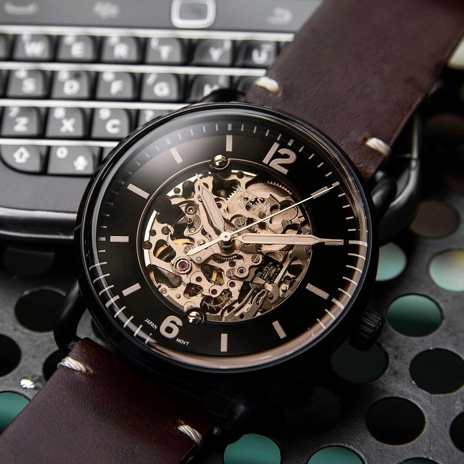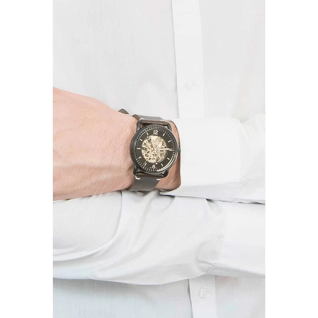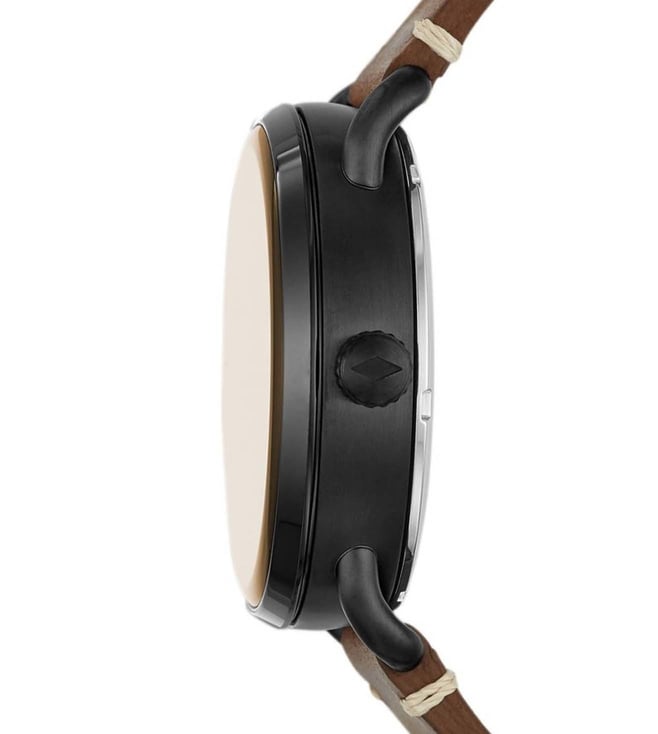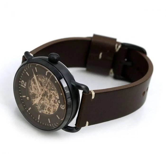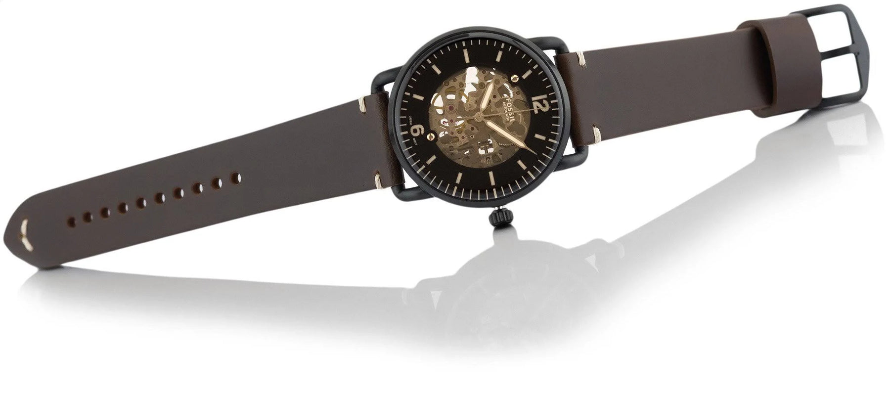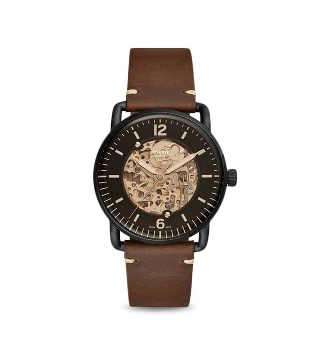 Enrich your accessory collection by owning this men's analog watch from Fossil's The Commuter collection. It features an inbuilt rotor so that you can turn the crown clockwise to feel some resistance. The Commuter watches, made to your standards, vaunts iconic construction and clean aesthetic that will meet your work to weekend needs. Housed in a 42 mm case, the black skeleton dial exudes plain three hands functional on an automatic movement, stick and numeral markings and a crown for time adjustment. Its brown leather strap is compatible with all 22mm straps.