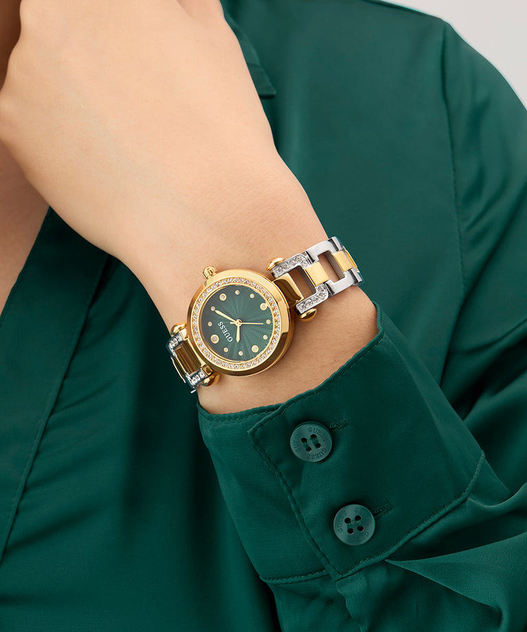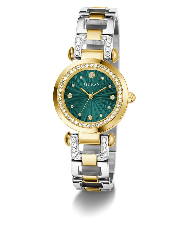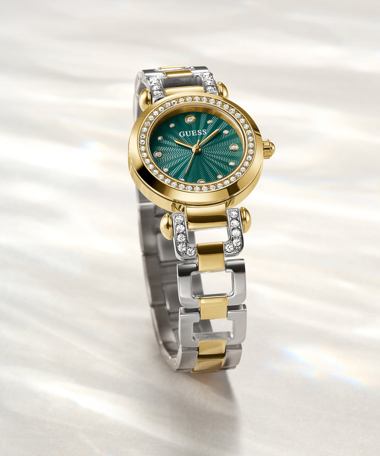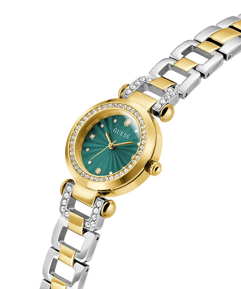 The Guess Ginger 2-Tone Gold Tone Analog Women's Watch - GW0869L1 is a chic jewelry-inspired timepiece designed for elegance and versatility. Featuring a petite 30mm gold-tone recycled steel case, a green sunray dial, and a 2-tone recycled steel horse-bit chain bracelet with self-adjustable G-links, this watch combines style with sustainable design. Crystal bezel accents and subtle glitz detailing make it perfect worn alone or stacked with other jewelry.