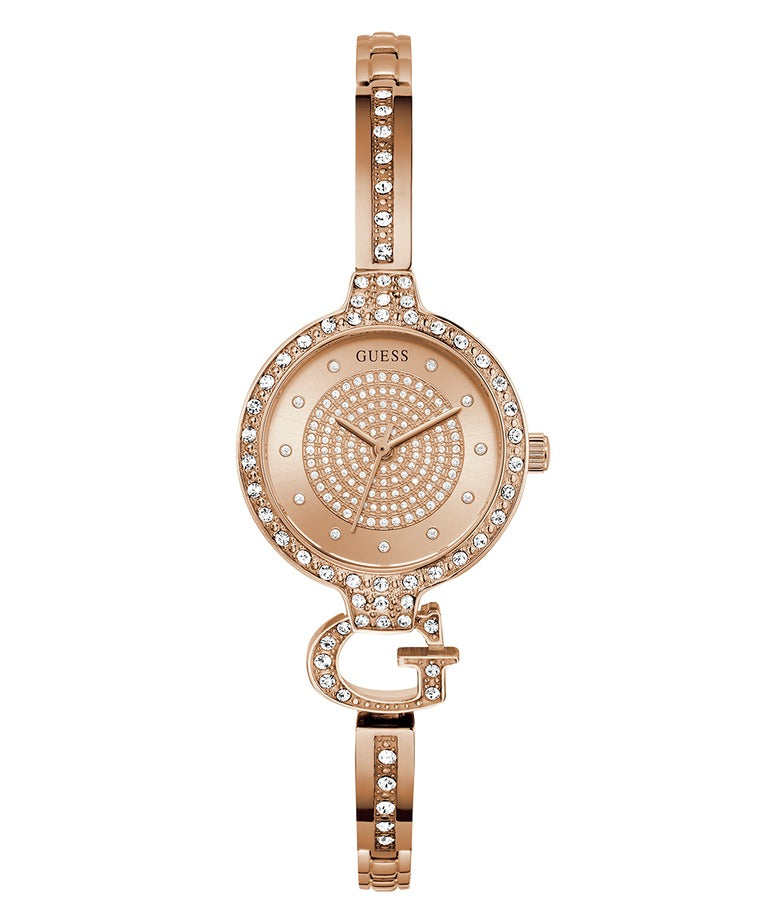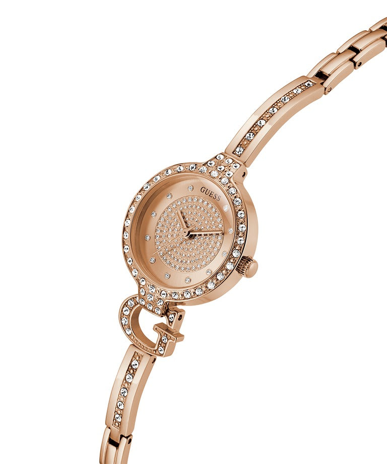 The Guess Giselle Rose Gold Tone Analog Women's Watch - GW0929L3 blends iconic style with contemporary elegance. Featuring a petite 28mm rose gold-tone recycled steel case, a crystal bezel, and a glitzy rose gold dial with the signature "G" logo, this watch is perfect for fashion-forward women. The self-adjustable G-link bracelet ensures a perfect fit, making it ideal worn alone or stacked with other jewelry.