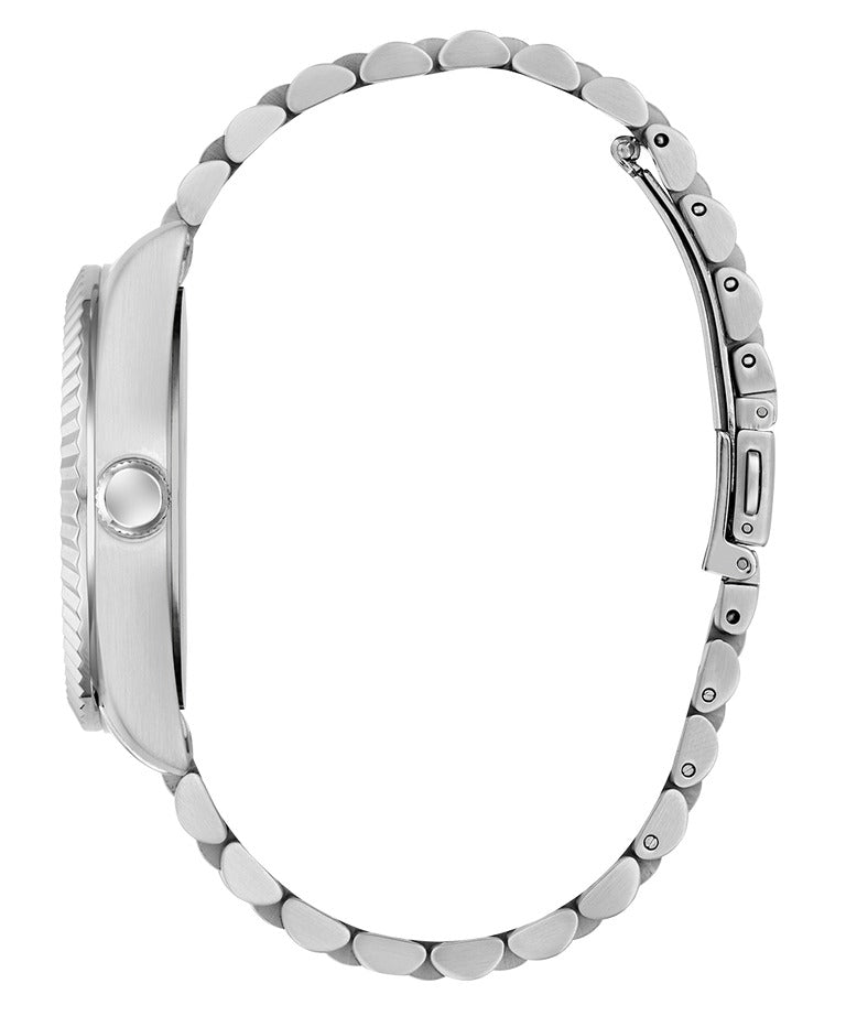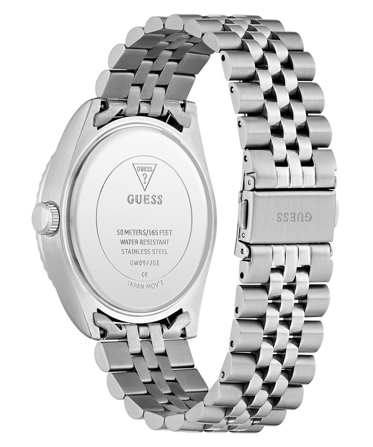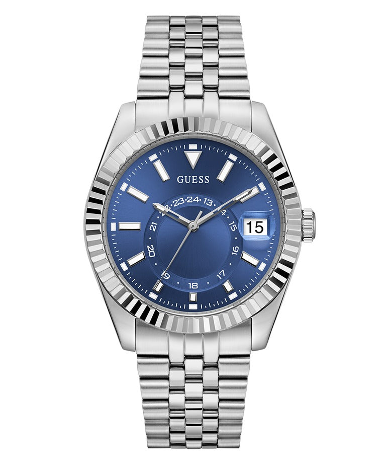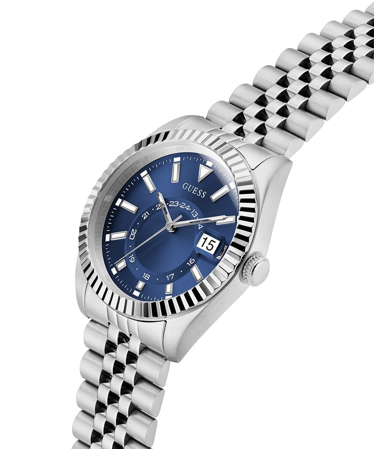The GUESS GW0977G1 Men's Jaden Multi-Function Watch showcases a sleek silver-tone design paired with practical everyday features. Crafted with a 42 mm recycled steel case featuring a brushed and polished finish, this stylish timepiece offers durability and modern appeal. The blue dial includes multifunction sub-dials and a date window for enhanced usability. Complemented by a matching silver-tone recycled steel bracelet and powered by a precise quartz analog movement, this watch delivers both reliability and refined style. With 50 m water resistance and a sturdy mineral crystal lens, it is perfectly suited for daily wear.