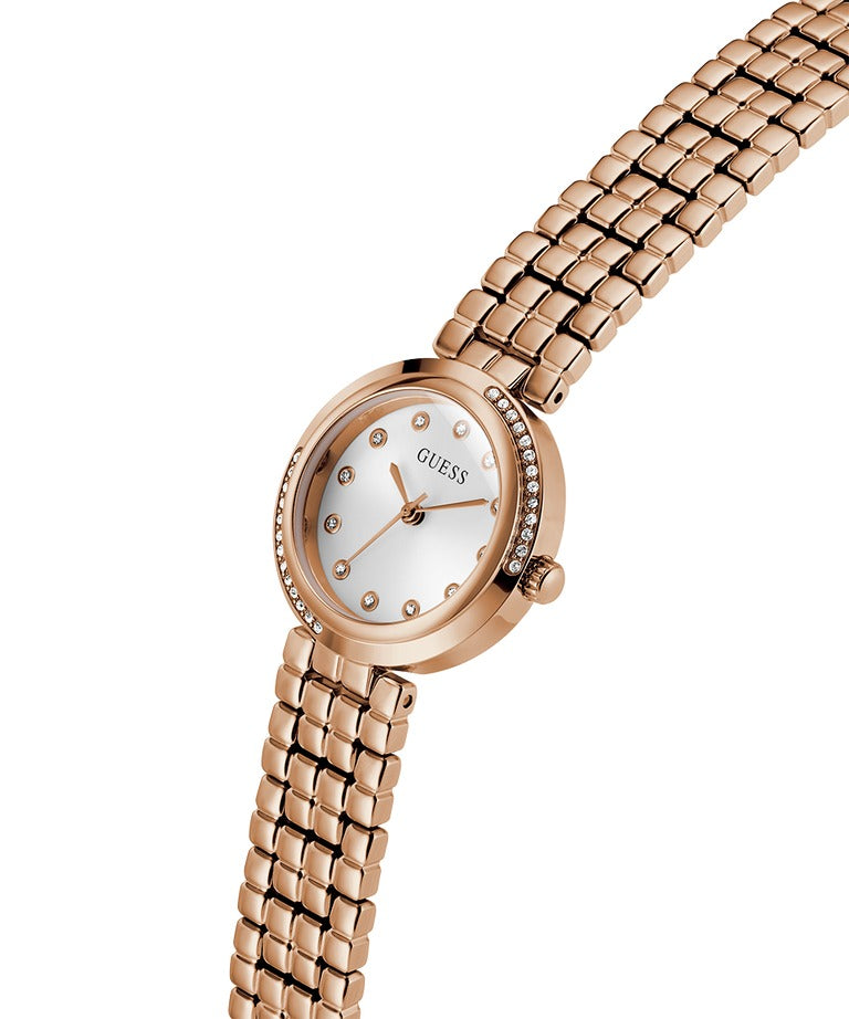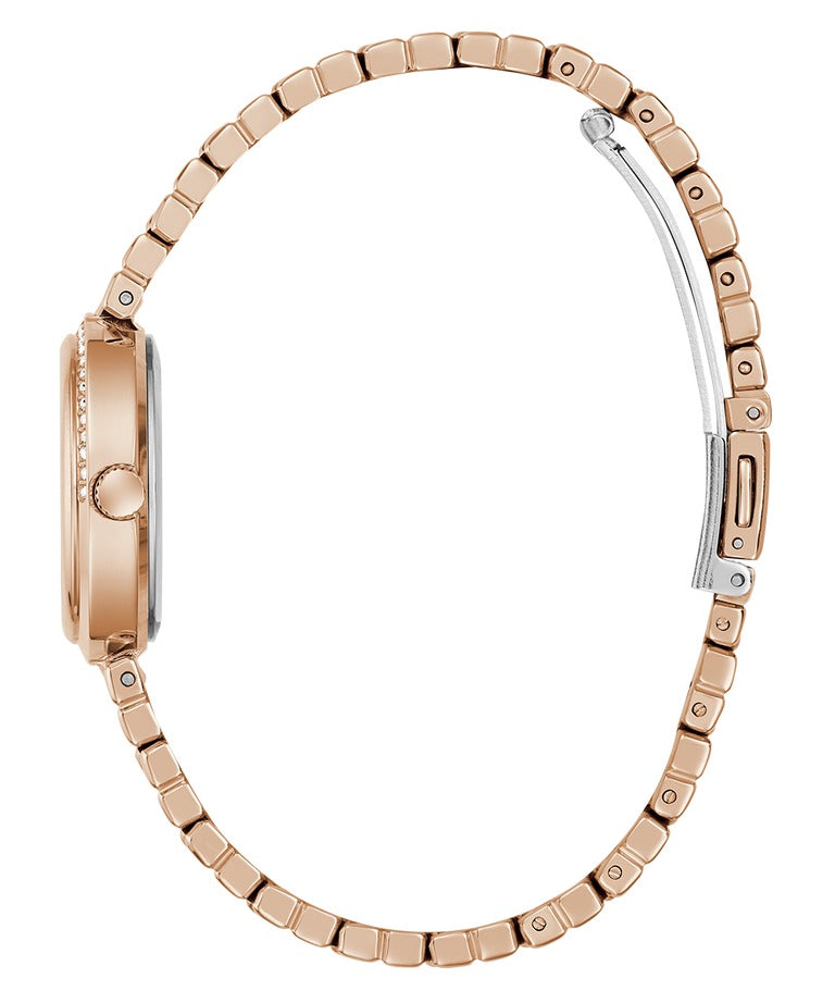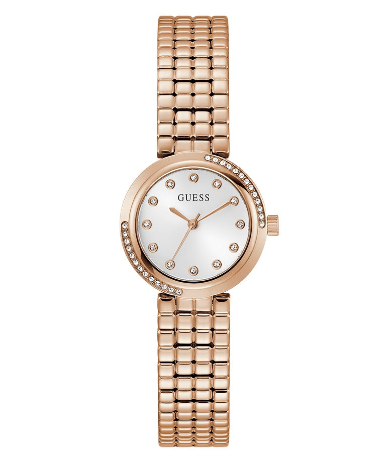 The GUESS GW0930L3 Ladies Rose Gold Tone Analog Watch brings elegant minimalism and refined style to everyday wear. Featuring a 28 mm polished recycled steel case in a striking rose gold tone, this timepiece offers durability with a luxurious finish. The clean white dial enhances readability while maintaining a timeless aesthetic. Paired with a matching rose gold tone recycled steel bracelet, this watch delivers both sophistication and comfort. Powered by a precise quartz analog movement and equipped with a flat mineral crystal, it ensures reliable performance. With 30 m water resistance, it is suitable for daily light exposure to water.