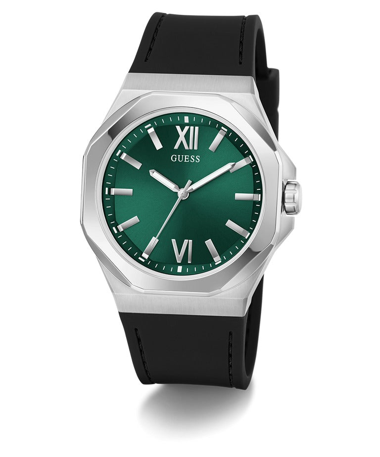 The GUESS Men's Watch (Model: GW0850G1) features a vibrant green sunray dial housed in a round brushed recycled steel case with a polished top ring, paired with a smooth black silicone strap with stitch detailing. Designed for the modern man, this analog timepiece with Quartz movement offers both style and reliability, making it perfect for casual and formal occasions.