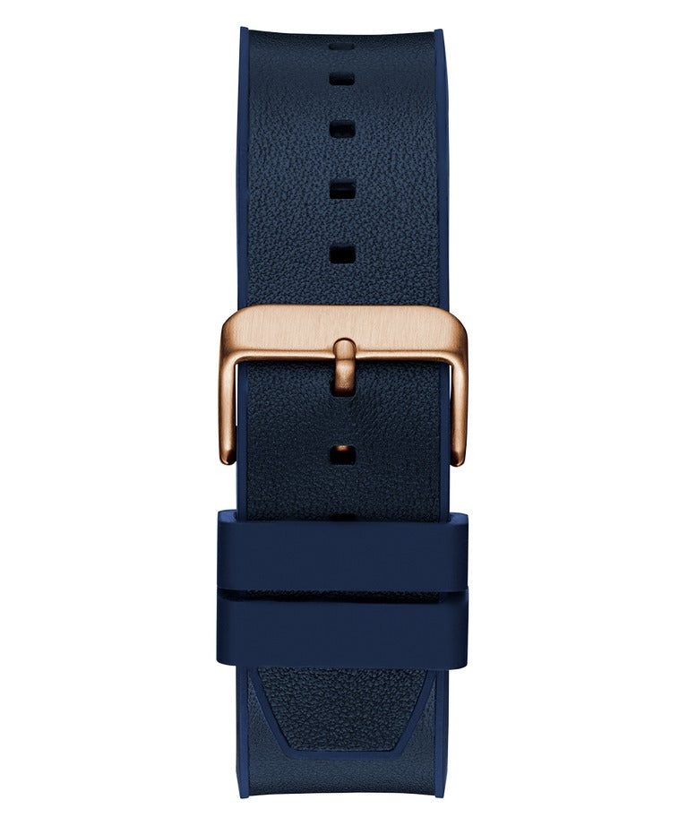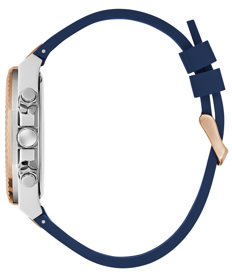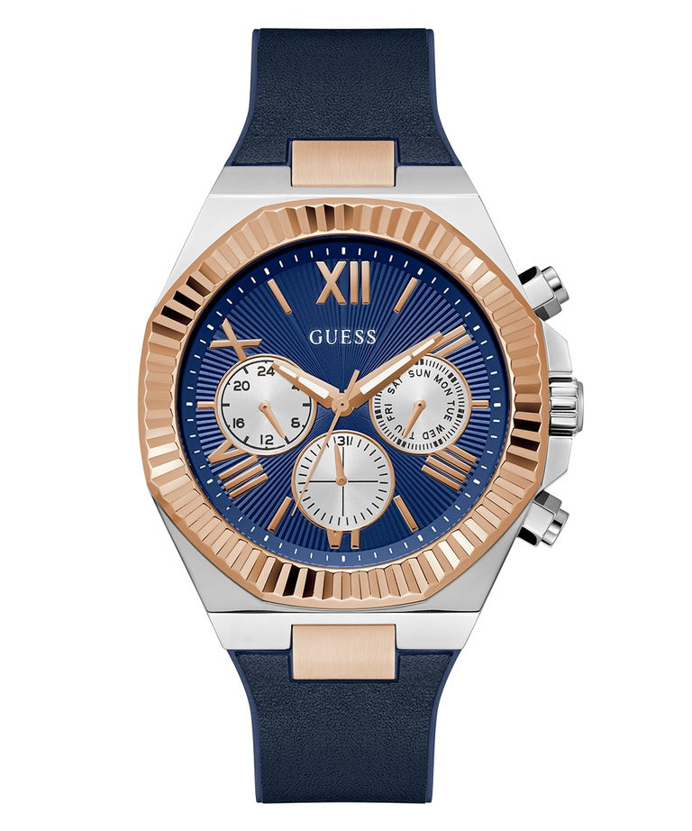 The GUESS Mens Blue 2-Tone Multi-function Watch (Model: GW0791G2) is an oversized and stylish timepiece designed for men who want a bold, contemporary look. Featuring a 44 mm round 2-tone polished recycled steel case with a coin edge bezel, this watch showcases a chrono-look multi-function blue dial. The FLEX strap combines a black smooth leather overlay on comfortable silicone for a perfect blend of style and wearability, secured with a strap buckle. Powered by precise quartz analog movement and protected by a durable mineral glass lens, this watch is water-resistant up to 50 meters, making it suitable for light swimming while maintaining everyday elegance.