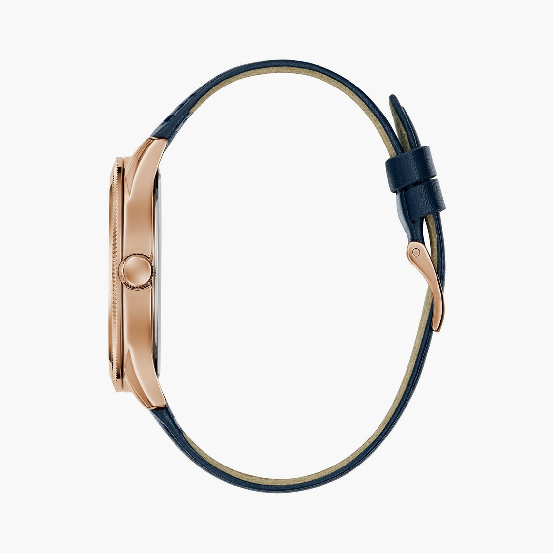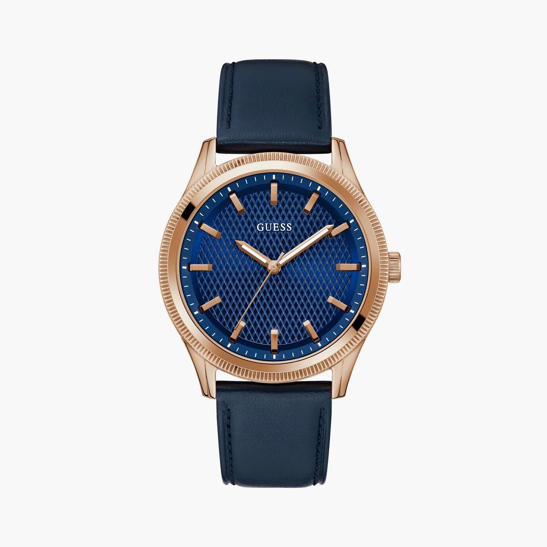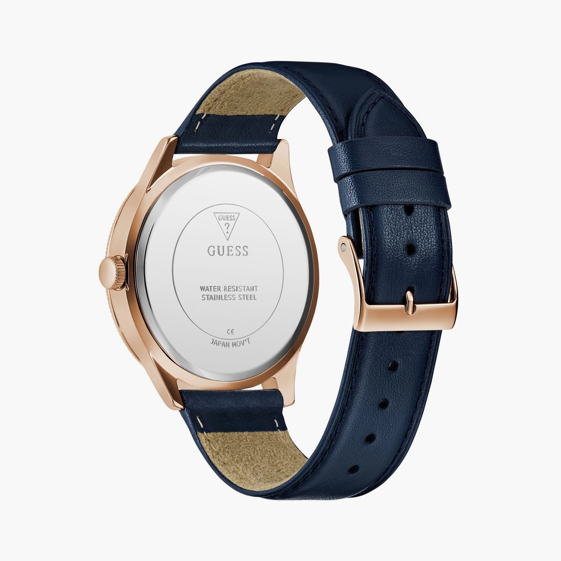 The GUESS Dress Analog Watch (Model: GW0846G2) makes a bold impression with its sophisticated design. It features a round blue dial with classic 3-hand movement and stick indices, covered by flat mineral glass for a sleek, durable finish. The watch is equipped with a navy leather strap secured with a tang buckle for a comfortable fit. With 30 meters of water resistance, this analog timepiece combines style, functionality, and durability, making it perfect for formal occasions or everyday wear.