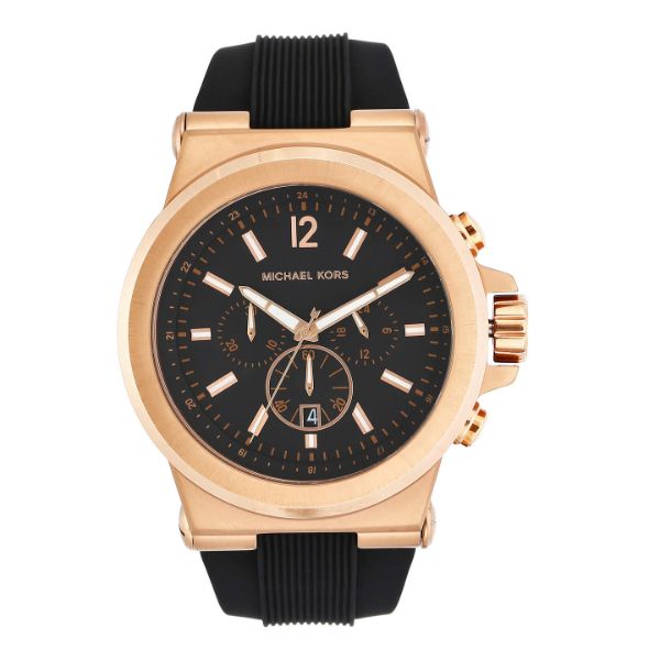 Presenting a stunning contrast of colors, this men's chronograph watch from the House of Michael Kors exudes power and influence. The black silicone strap with a tang buckle is paired with a contrasting rose-gold stainless steel case. This case further encases a black high-visibility dial with three sub-dials. The dial has rose-gold baton hour markers, three hands with a date panel which shines out distinctly on the dial.