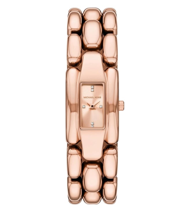 The Michael Kors Hally Quartz Women’s Watch (MK4954) blends contemporary elegance with a sleek, minimalist profile. Designed with a 21 mm rectangular stainless steel case and a matching rose gold stainless steel strap, this timepiece is perfect for women who appreciate refined style in a compact silhouette. Powered by a reliable quartz movement and equipped with 50 m water resistance, it is ideal for everyday sophistication.