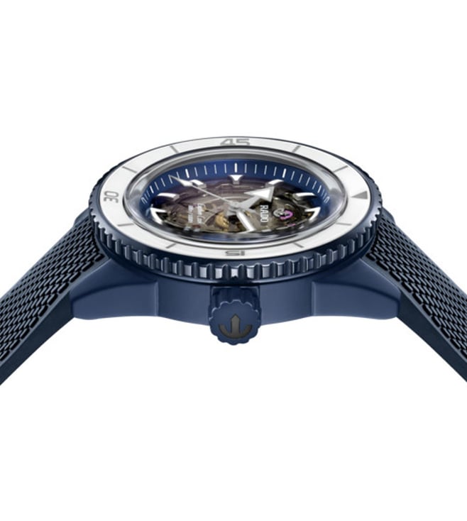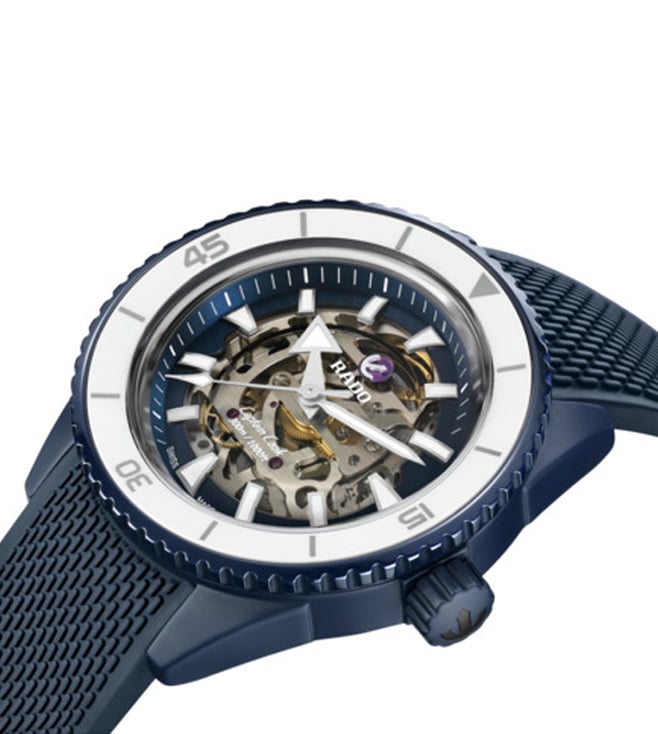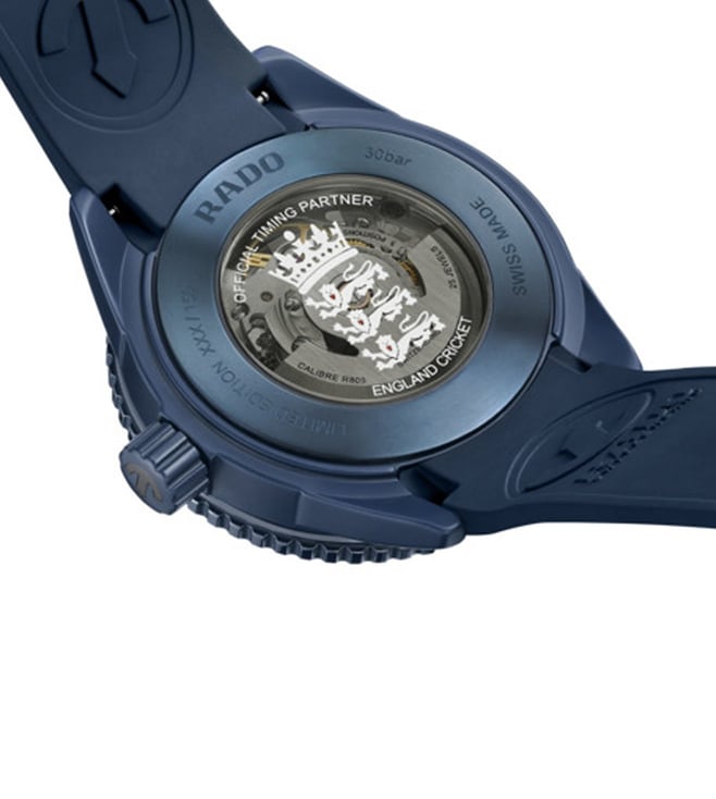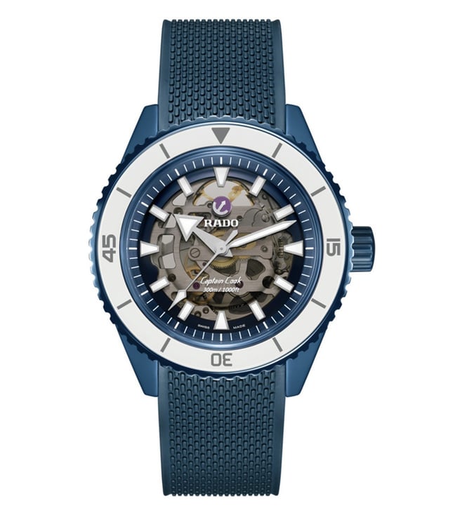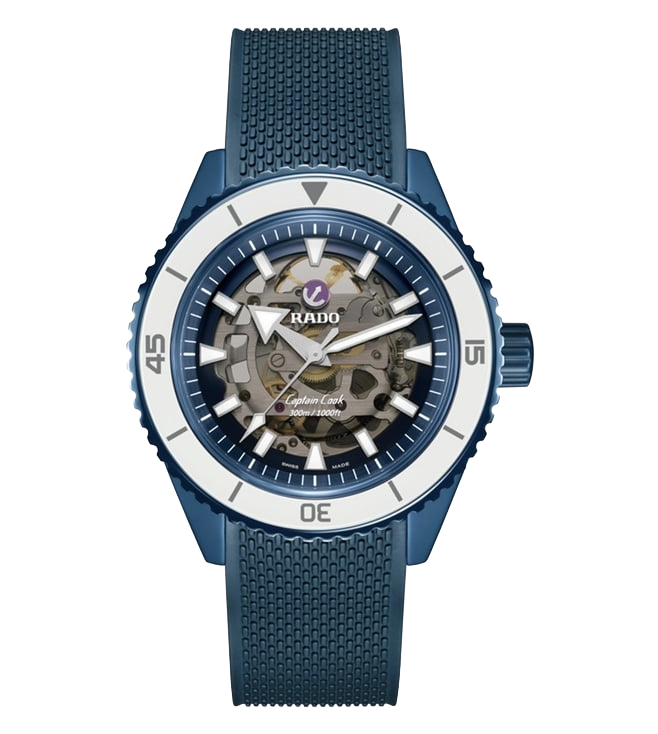 Inspired by the spirit of adventure and built for those who explore beyond the ordinary, the Rado Captain Cook Automatic R32153208 combines rugged functionality with unmistakable style. This unisex timepiece features a bold 43 mm ceramic case paired with a blue dial and matching rubber strap. Its unidirectional rotating bezel and see-through case back showcase both technical prowess and visual appeal. Equipped with the automatic R808 calibre, the watch boasts up to 80 hours of power reserve and high precision. Super-LumiNova® on hands and markers ensures readability in low light, while the 300-meter water resistance makes it ideal for professional diving and water sports. Limited in availability, this watch is a powerful statement of Swiss craftsmanship and innovation.