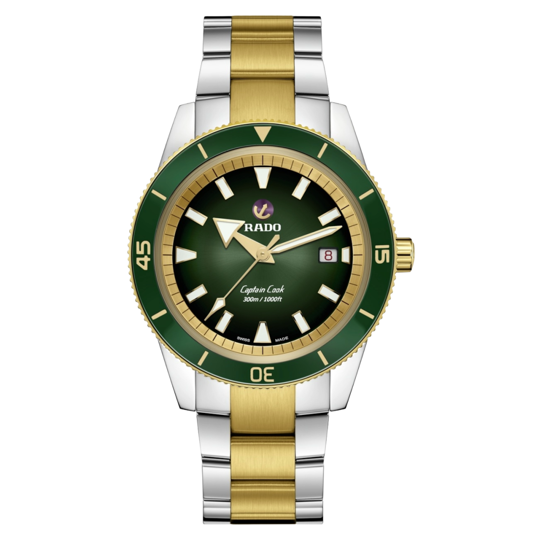 This 42 mm Captain Cook Automatic watch features a striking lacquered green-to-black gradient dial that seamlessly complements the stainless-steel bracelet with yellow-gold-coloured middle links. The rose-gold-coloured hands and indexes are coated with white Super-LumiNova®, ensuring high legibility in all lighting conditions. Housed in a polished stainless-steel case with a box-shaped sapphire crystal, this timepiece creates a distinctive ‘bubble’ visual effect. Inside, the high-performance Rado calibre R763 automatic movement is tested in 5 positions for superior accuracy and reliability. With an 80-hour power reserve and an EasyClip system for effortless strap changes, this watch offers both functionality and standout design—perfect for everyday style or special occasions.