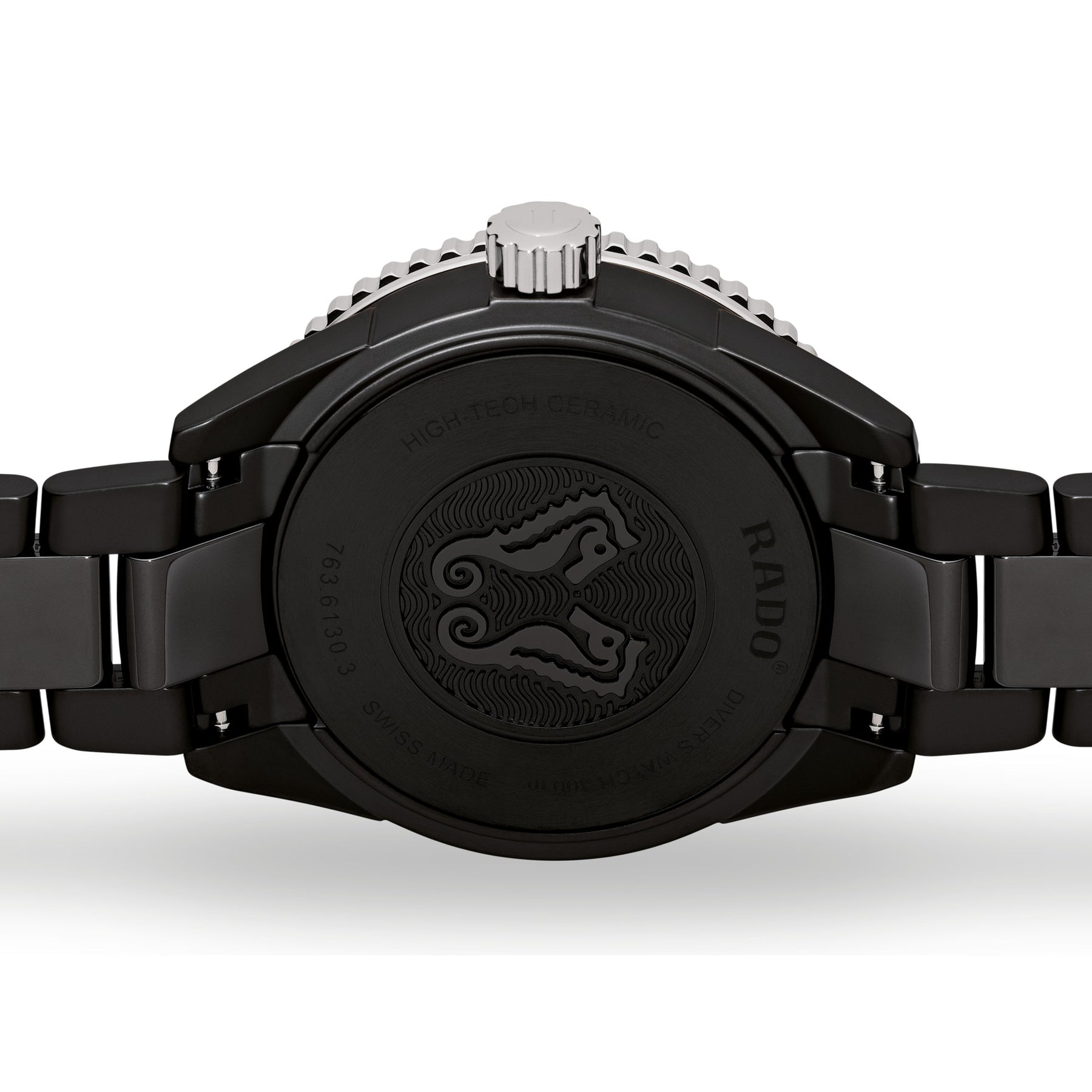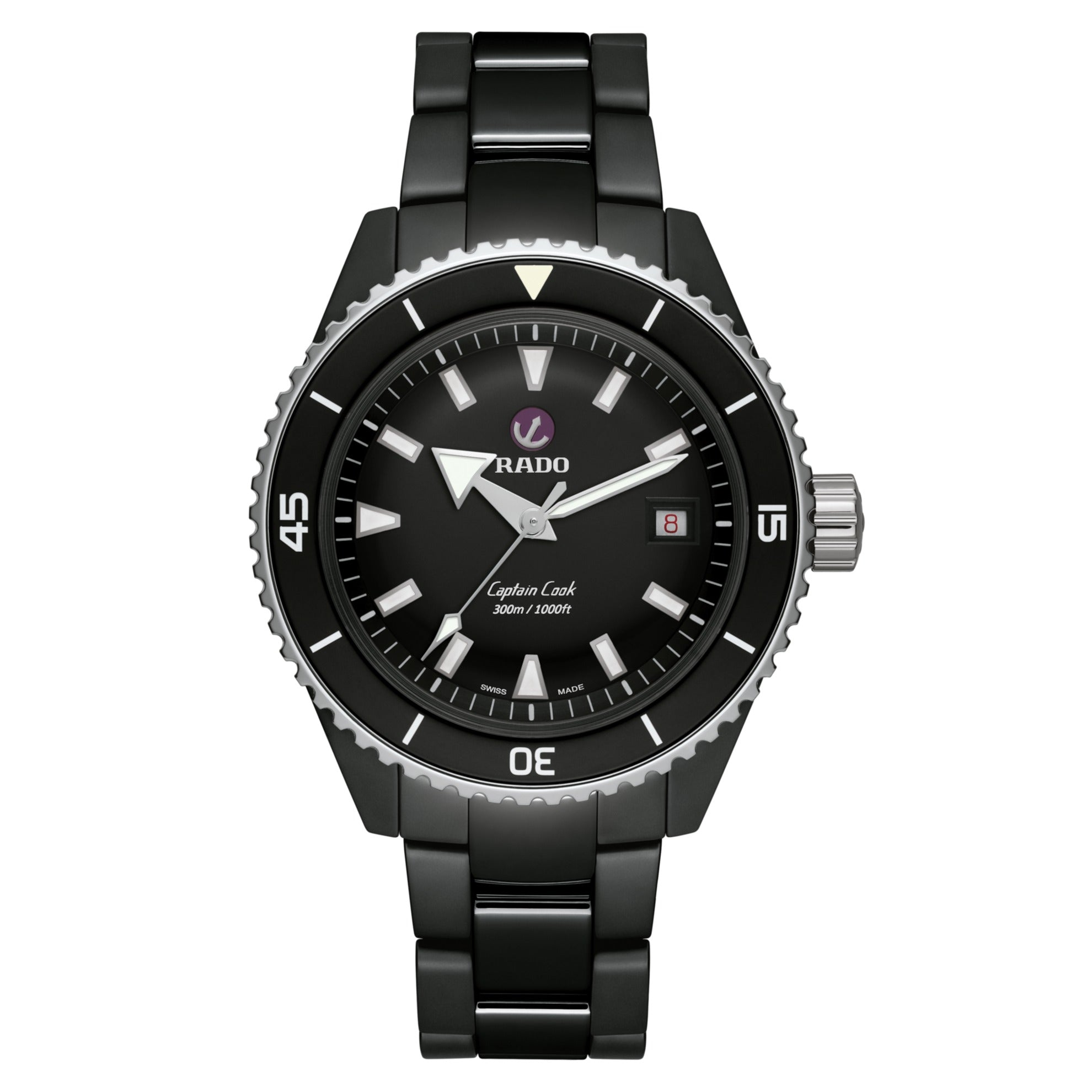 The Captain Cook High-Tech Ceramic Diver watch is water resistant down to 300 m. The hands and indices of the ISO 6425 certified diver's watch are coated with SuperLuminova® to ensure excellent visibility on the black lacquered and polished dial. The 43 mm monobloc case is made of matt black high-tech ceramic, while the rotating bezel is made of polished stainless steel. Inside, the Rado R763 automatic movement exceeds standard accuracy test requirements from 3 to 5 positions and offers 80 hours of power reserve. This model comes with a matte black rubber strap. Whatever your field of exploration is, your Captain Cook High-Tech Ceramic Diver will be a reliable and solid partner at your side for years to come.