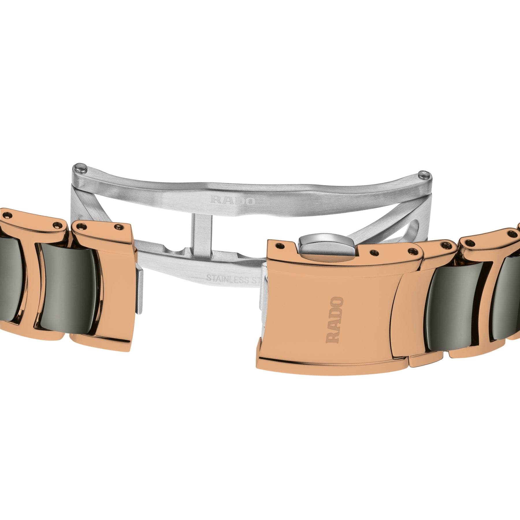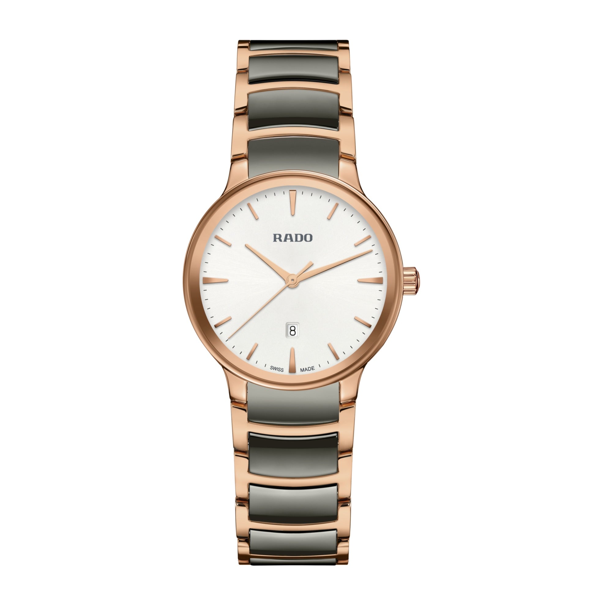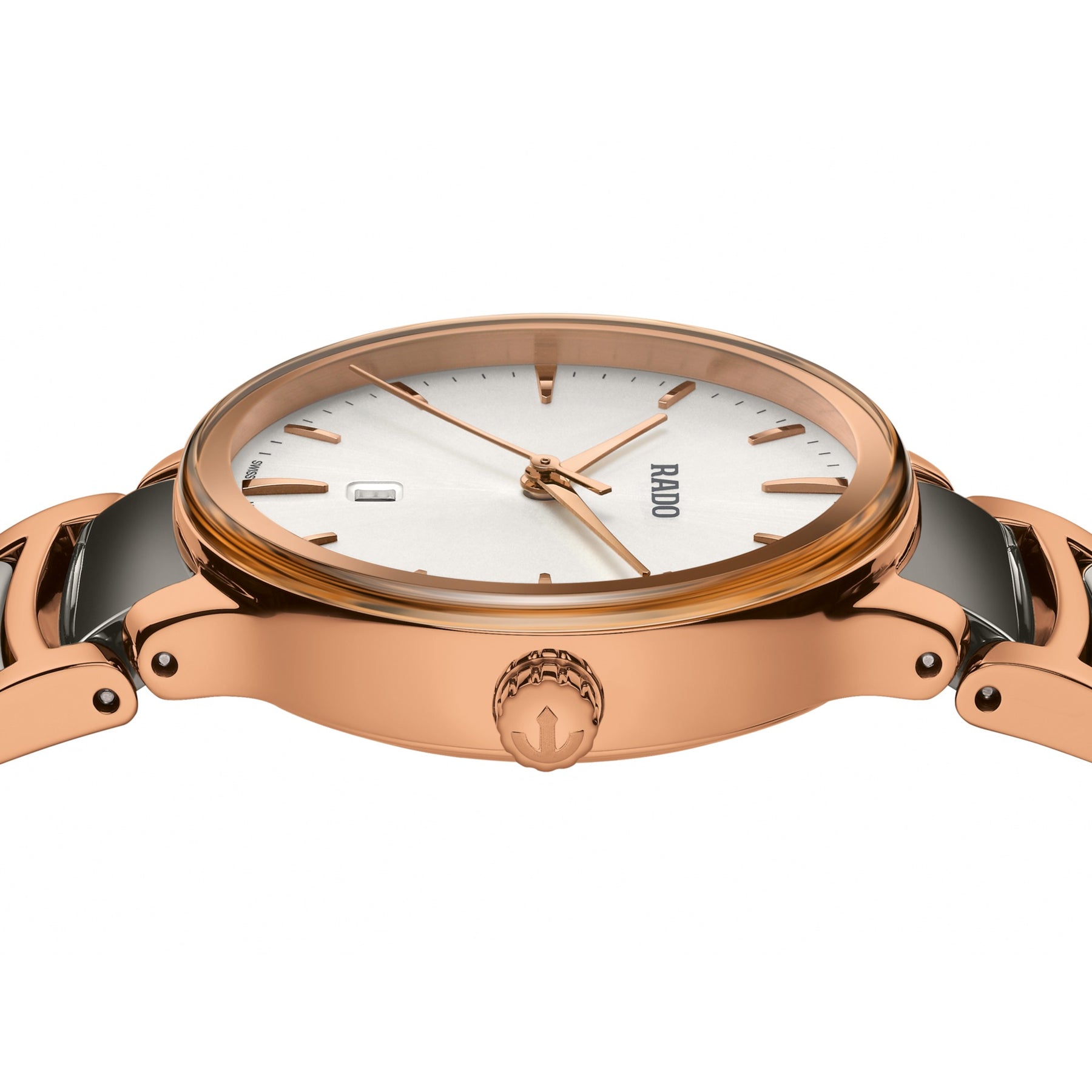 The classic Centrix Quartz has been reworked not only technically, but also aesthetically. The modified model has a rounded sapphire crystal that extends all the way to the edge and a curved case blending with the curved crystal edge. The overall appearance of this iconic timepiece is completed with adjusted case lugs and a bracelet made of polished rose gold-coloured PVD-coated stainless steel with plasma high-tech ceramic middle links. The silver sunray dial with rose gold-coloured applied indexes matches perfectly with the rose gold-coloured hands. Thanks to the PreciDrive and HeavyDrive features in the calibre R079 quartz movement, the watch has greater accuracy and resistance to shocks. The watch is water-resistant down to 50 m.